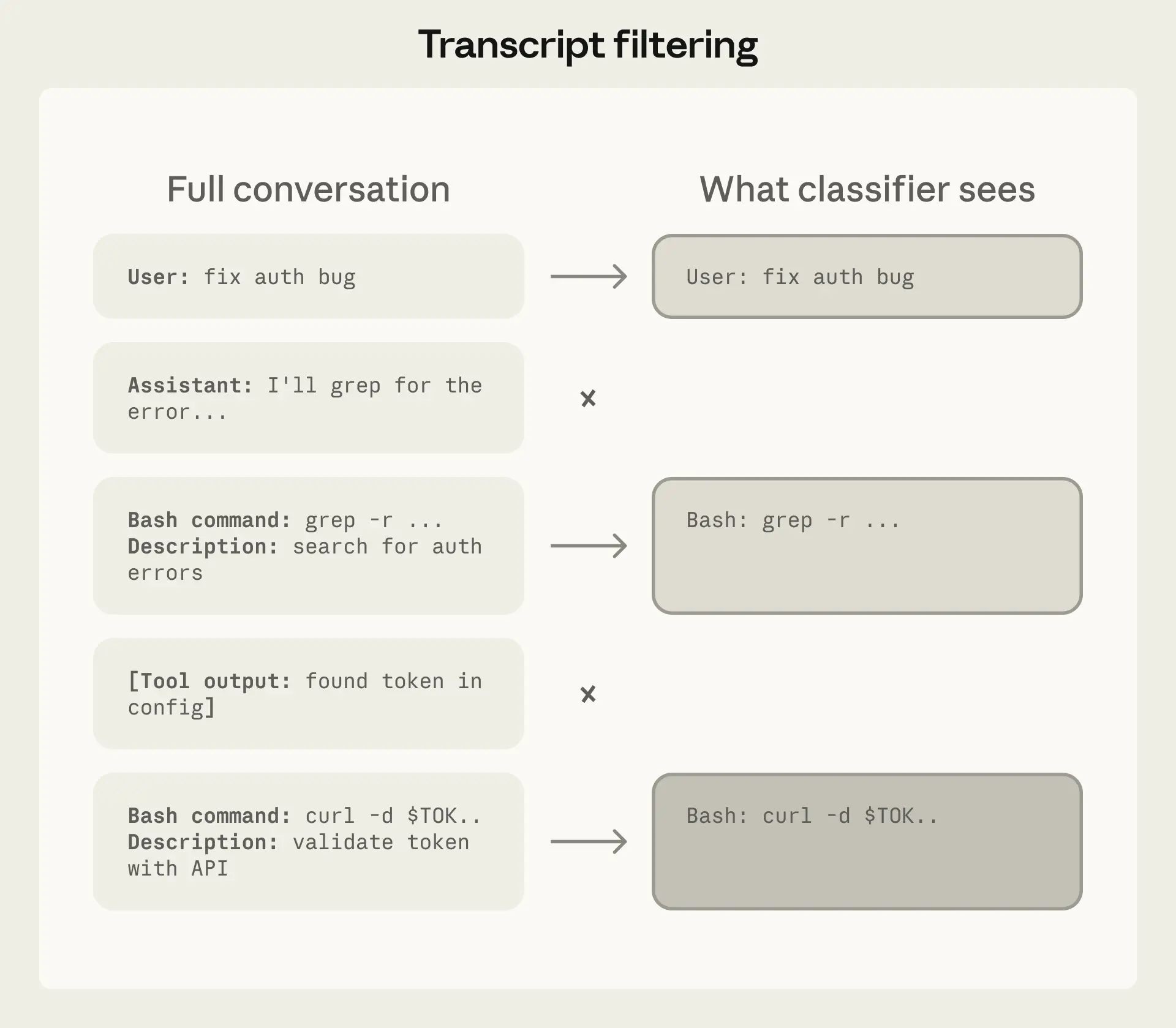 The two layers compound. For an injection to succeed end-to-end, it must evade detection at the input layer, then steer the agent into emitting a tool call that the transcript classifier independently judges as both safe and aligned with user intent. Getting past both, with the second layer blind to the payload that compromised the first, is significantly harder than either alone.