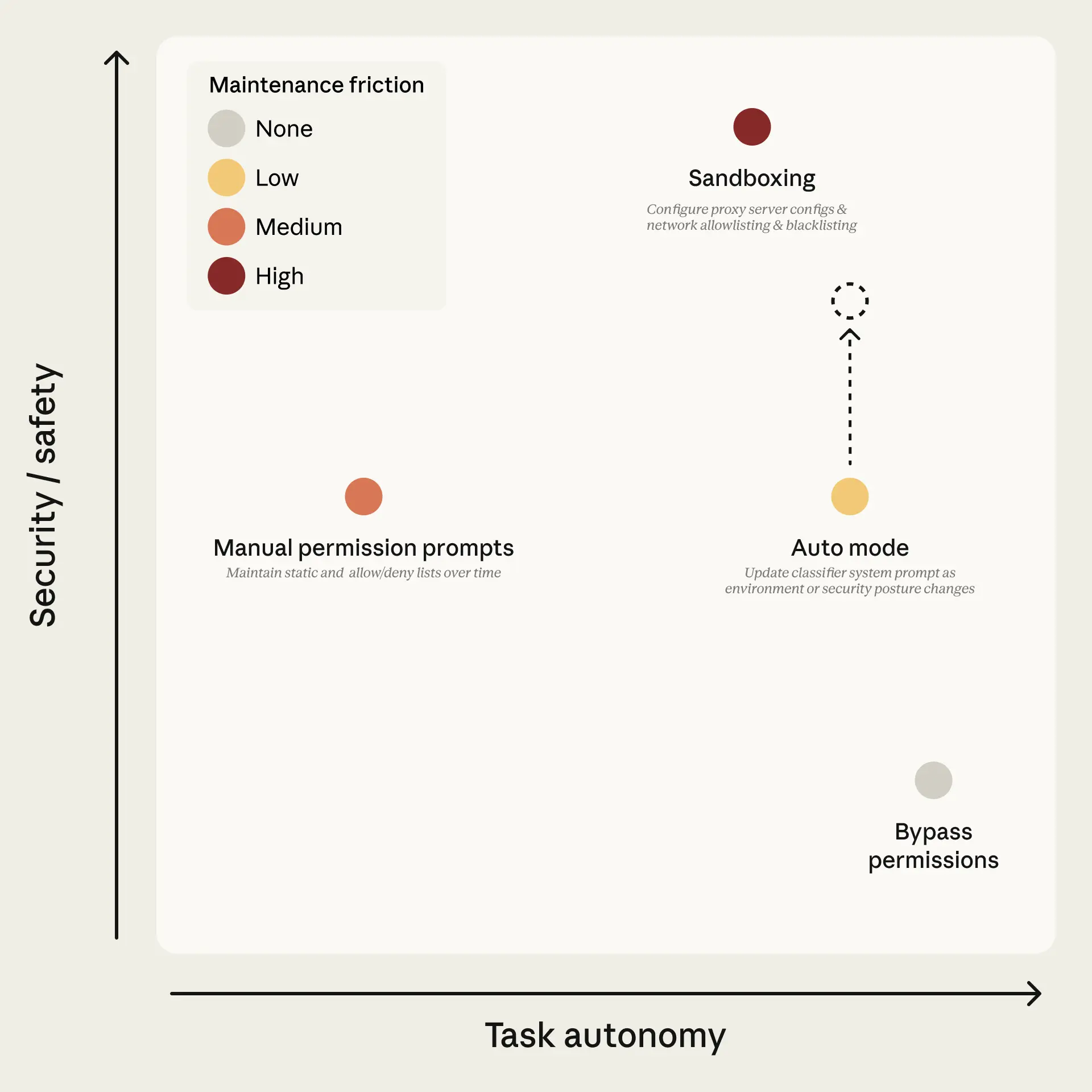 Users have two solutions for avoiding this fatigue: a built-in sandbox where tools are isolated to prevent dangerous actions, or the --dangerously-skip-permissions flag that disables all permission prompts and lets Claude act freely, which is unsafe in most situations. Figure 1 lays out the tradeoff space. Sandboxing is safe but high-maintenance: each new capability needs configuring, and anything requiring network or host access breaks isolation. Bypassing permissions is zero-maintenance but offers no protection. Manual prompts sit in the middle, and in practice users accept 93% of them anyway.