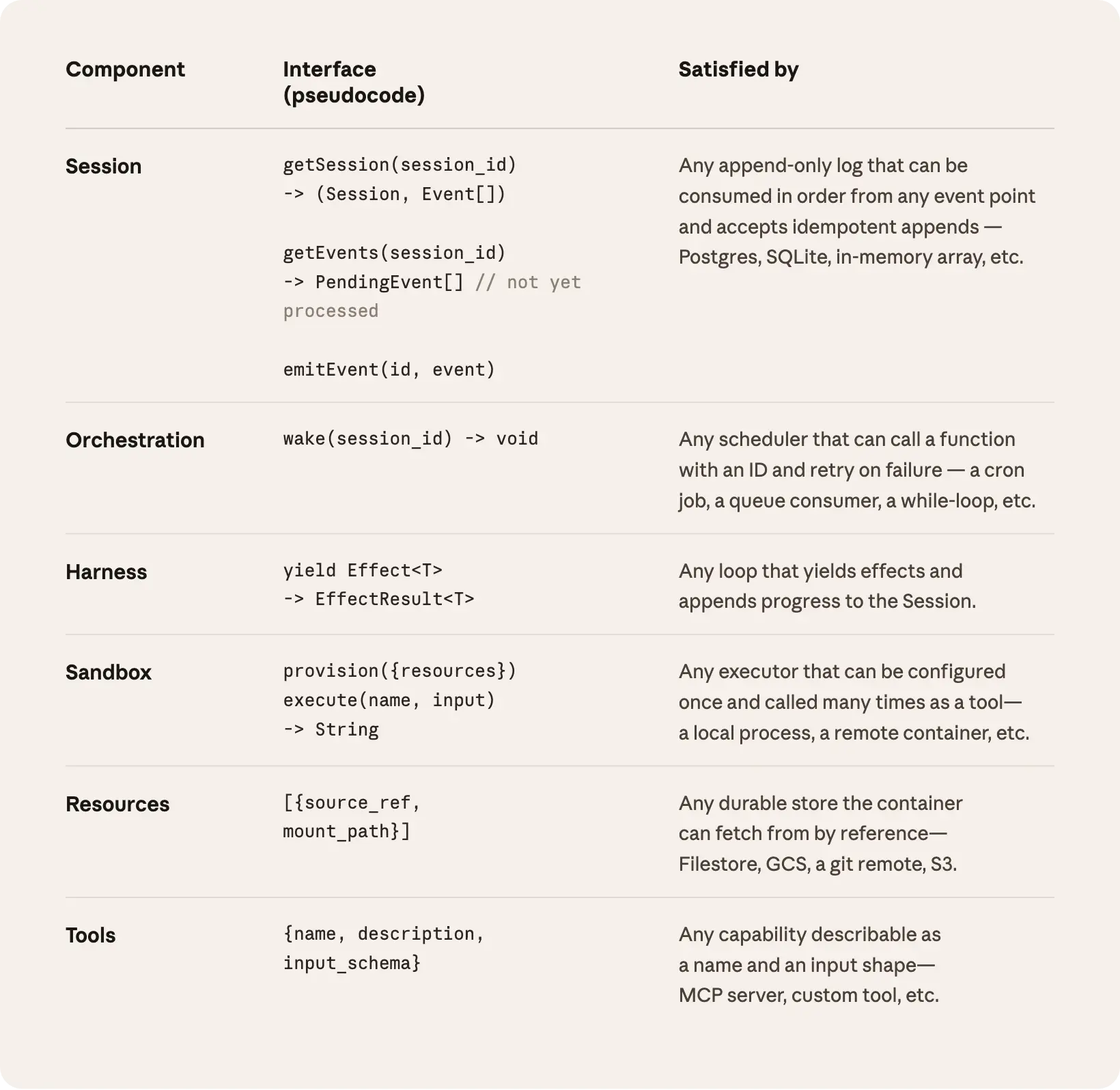 Decoupling the brain from the hands makes each hand a tool, execute(name, input) → string: a name and input go in, and a string is returned. That interface supports any custom tool, any MCP server, and our own tools. The harness doesn’t know whether the sandbox is a container, a phone, or a Pokémon emulator. And because no hand is coupled to any brain, brains can pass hands to one another.