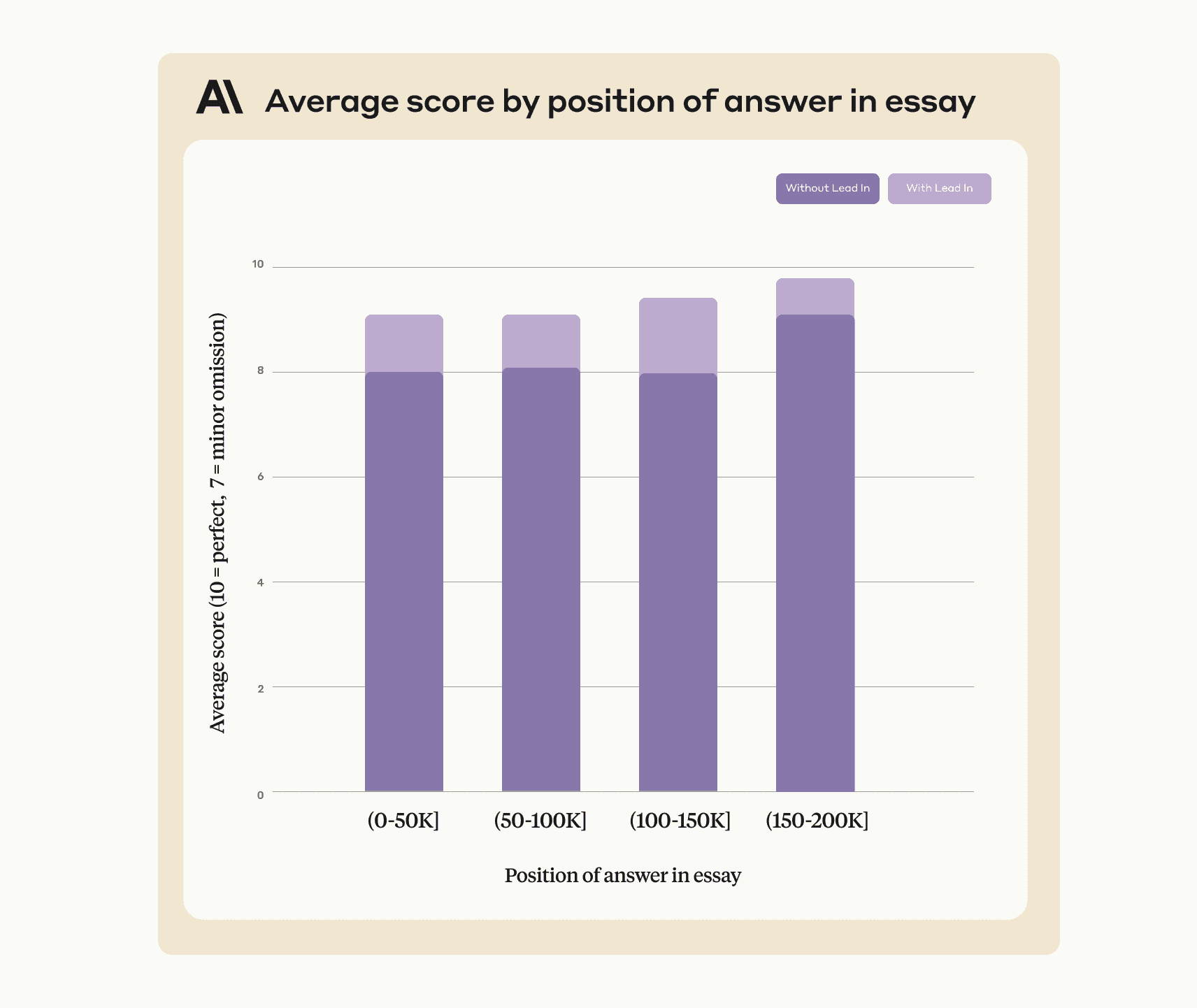 Claude gets this correct regardless of where the line with the answer sits in the context, with no modification to the prompt format used in the original experiment. As a result, we believe Claude 2.1 is much more reluctant to answer when a sentence seems out of place in a longer context, and is more likely to claim it cannot answer based on the context given. This particular cause of increased reluctance wasn’t captured by evaluations targeted at real-world long context retrieval tasks.