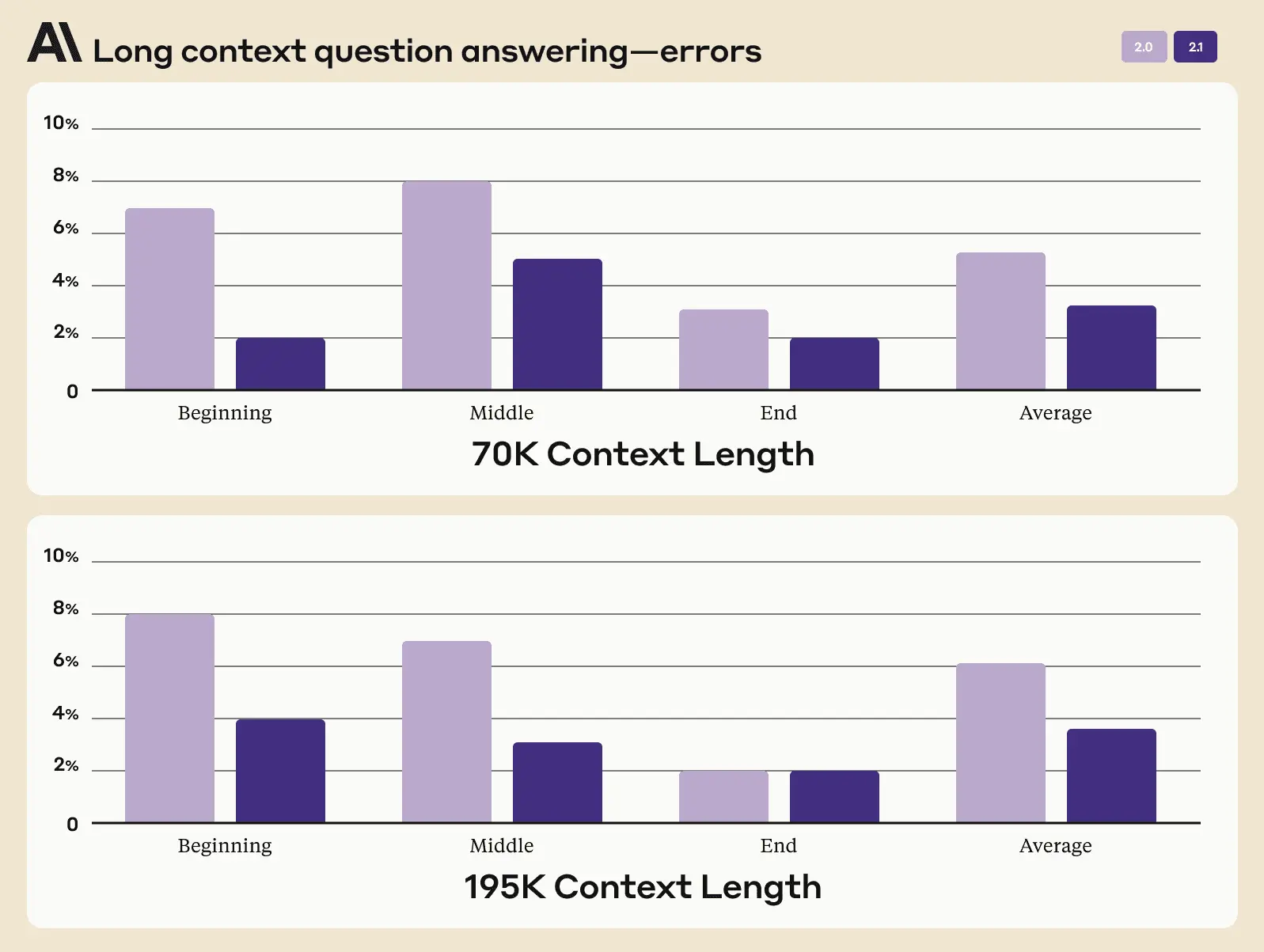 Being trained on real-world, complex retrieval tasks is why Claude 2.1 shows a 30% reduction in incorrect answers compared with Claude 2.0, and a 3-4x lower rate of mistakenly stating that a document supports a claim when it does not.