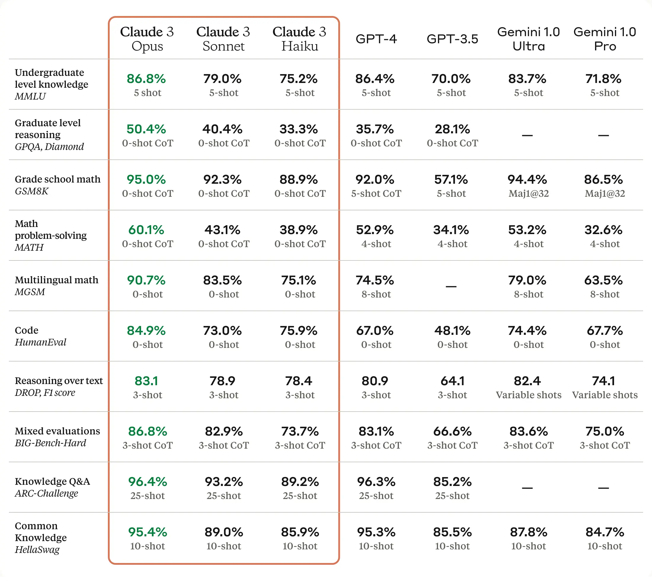 Opus, our most intelligent model, outperforms its peers on most of the common evaluation benchmarks for AI systems, including undergraduate level expert knowledge (MMLU), graduate level expert reasoning (GPQA), basic mathematics (GSM8K), and more. It exhibits near-human levels of comprehension and fluency on complex tasks, leading the frontier of general intelligence.