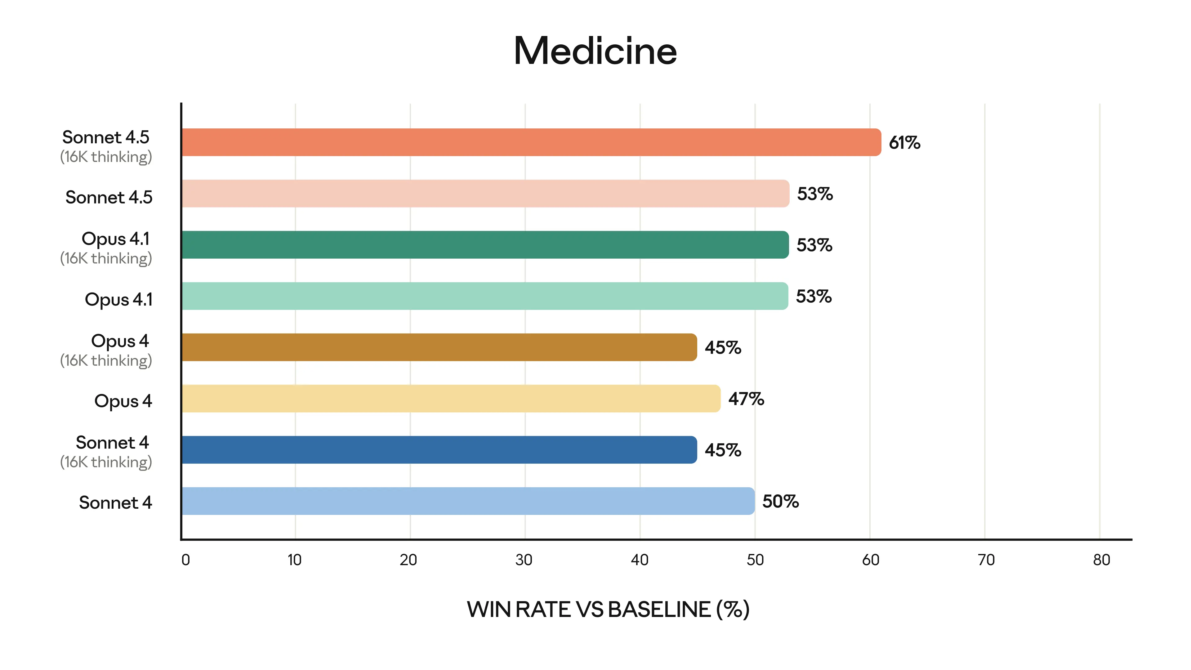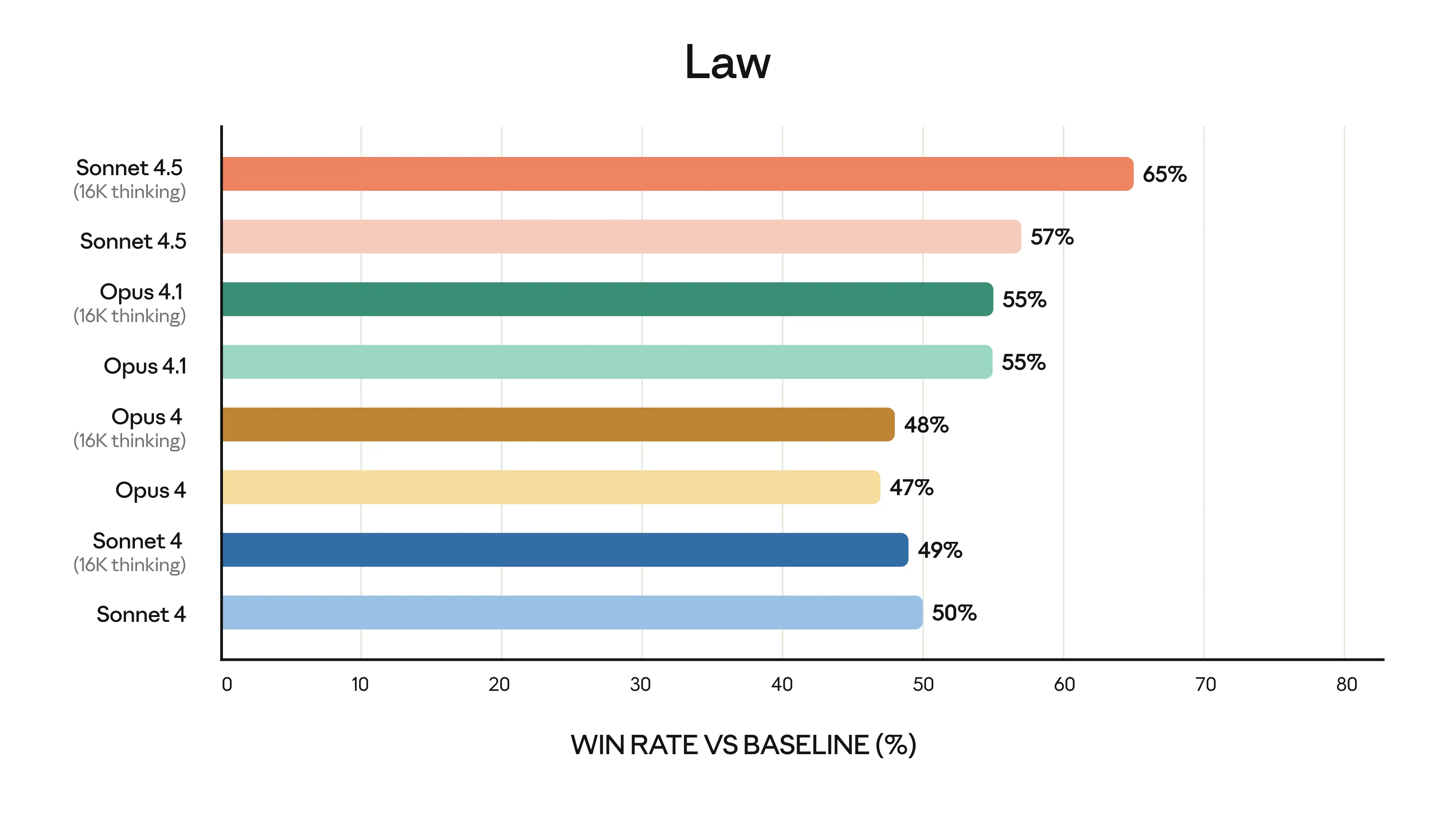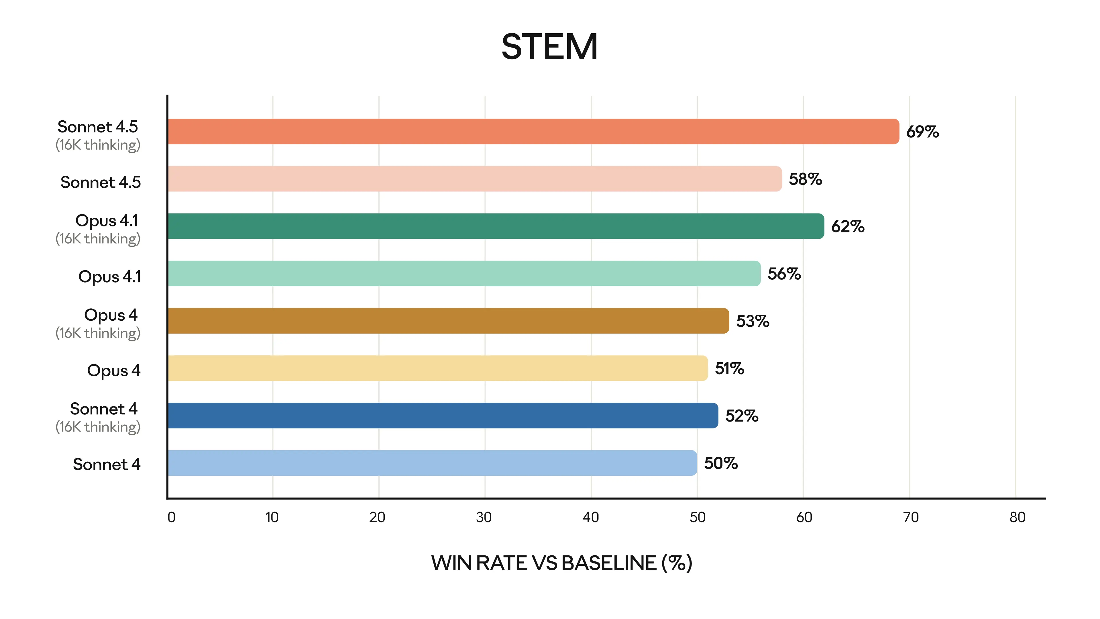 Experts in finance, law, medicine, and STEM found Sonnet 4.5 shows dramatically better domain-specific knowledge and reasoning compared to older models, including Opus 4.1.