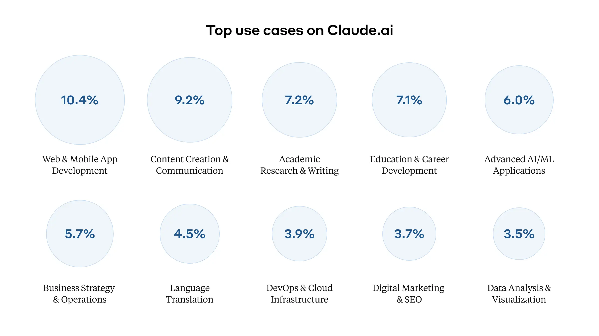 We used Clio to analyze 1 million conversations with Claude on claude.ai (both the Free and Pro tiers) to identify the top tasks people use Claude for. This revealed a particular emphasis on coding-related tasks: the "Web and mobile application development" category represented over 10% of all conversations. Software developers use Claude for tasks ranging from debugging code to explaining Git operations and concepts.