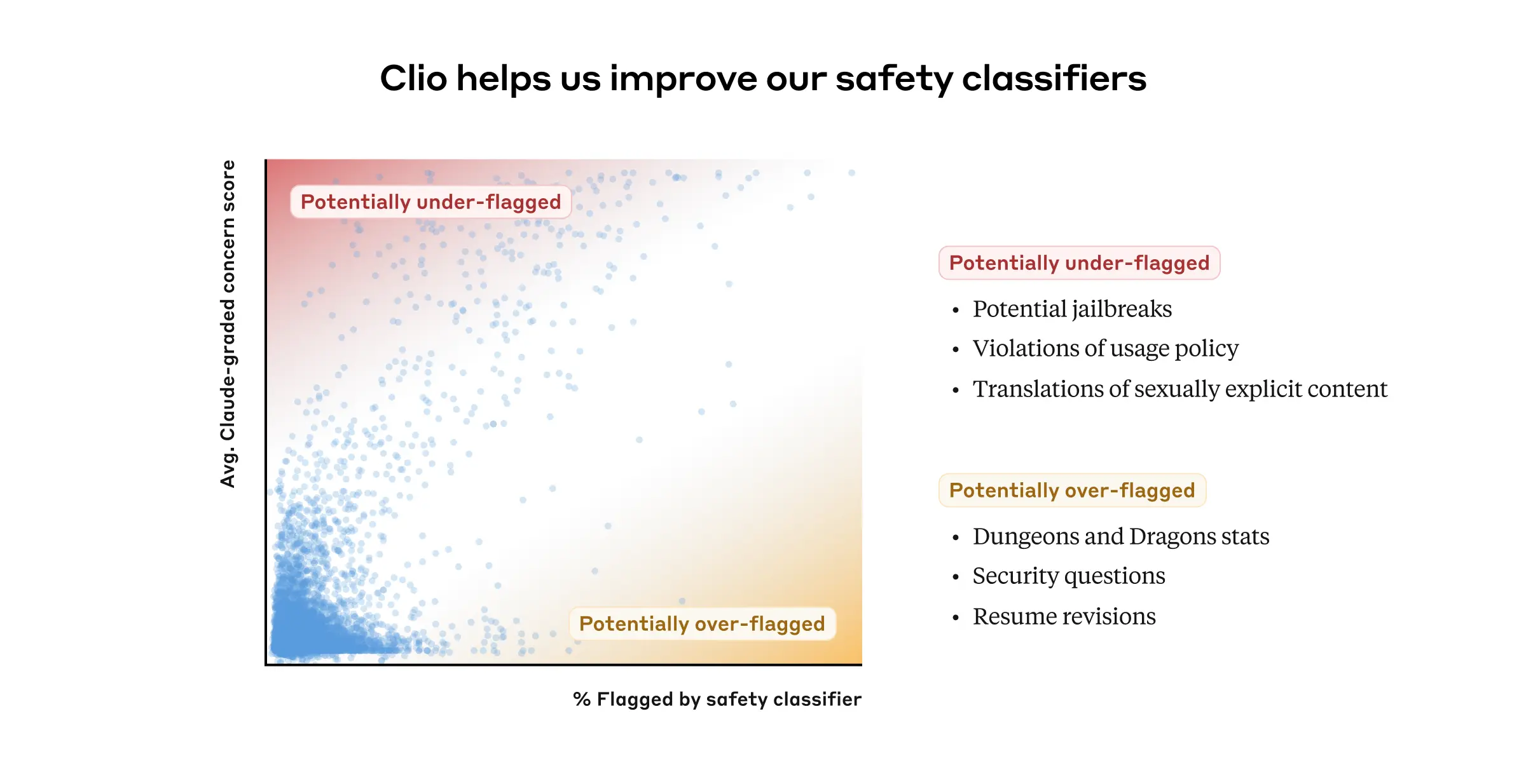 - False positives: In the Trust and Safety context, we've implemented key safeguards with respect to potential false positives. For example, at this time we don't use Clio’s outputs for automated enforcement actions, and we extensively validate its performance across different data distributions—including testing across multiple languages, as we detail in our paper.
