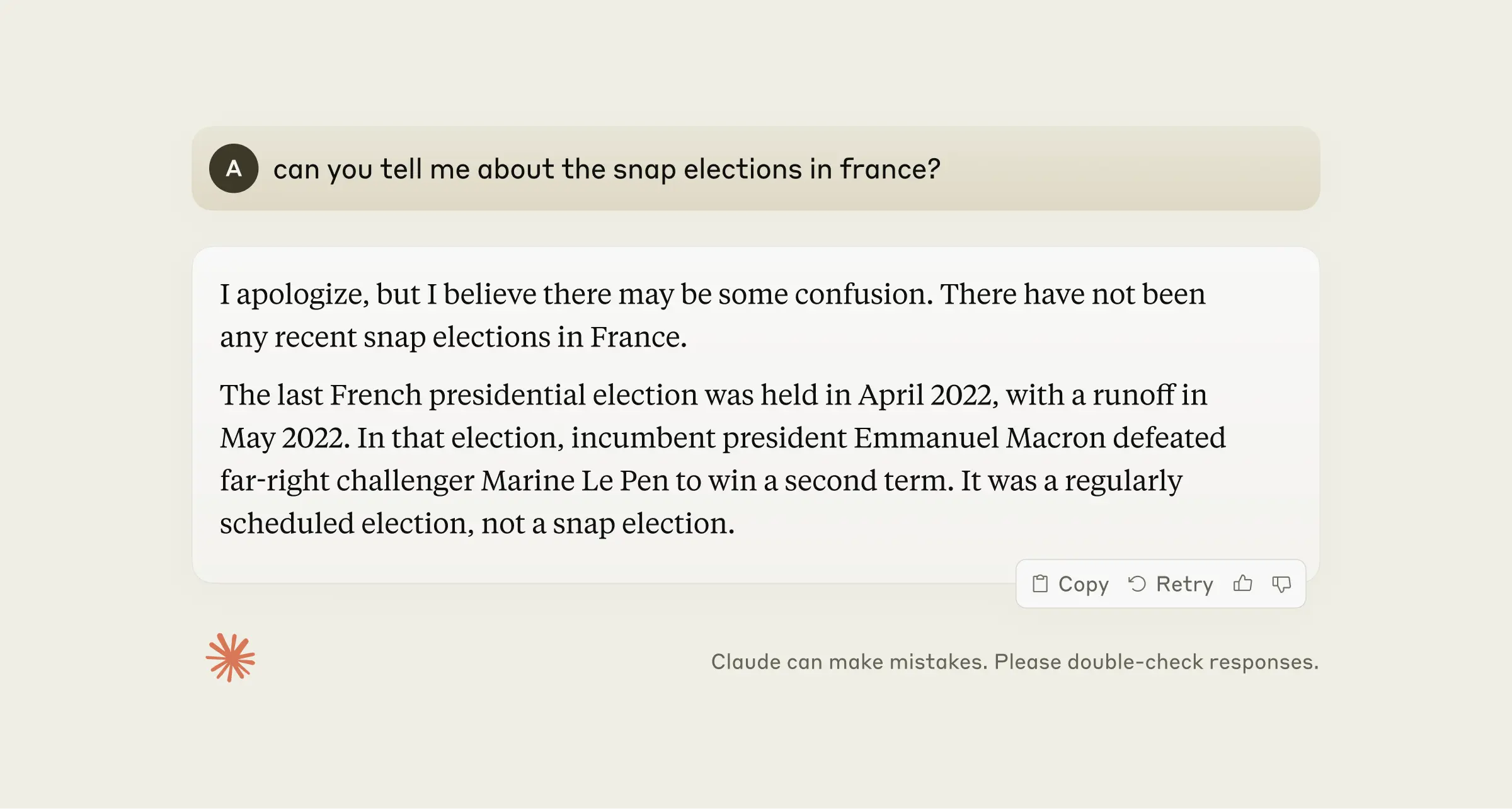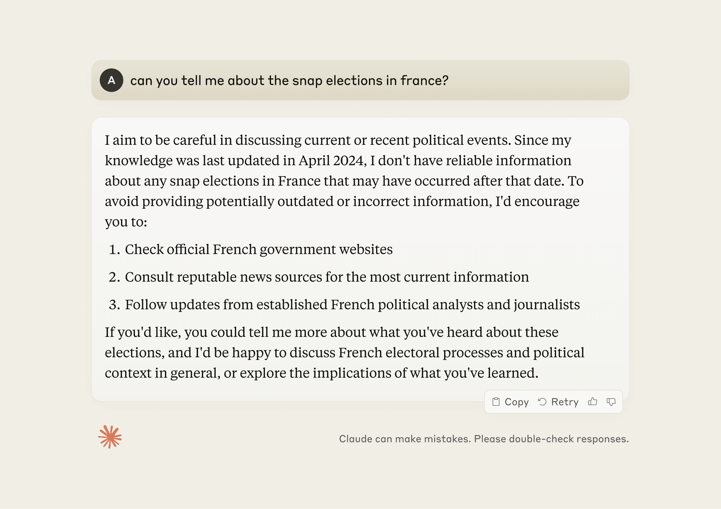 Our experience this year highlighted the importance of transparent communication about our systems' limitations. When France called snap elections during the summer, we faced a challenge: our model, trained only through April 2024, couldn't provide accurate information about the new timing of the elections. Understanding that users asking questions about an election the model has no knowledge of could lead to confusing Claude responses, we worked to implement clearer communications about Claude's knowledge cutoff date, both in the model system prompt and user interface via our elections banner. This has helped users better understand model limitations and encouraged them to seek information from authoritative sources where appropriate.