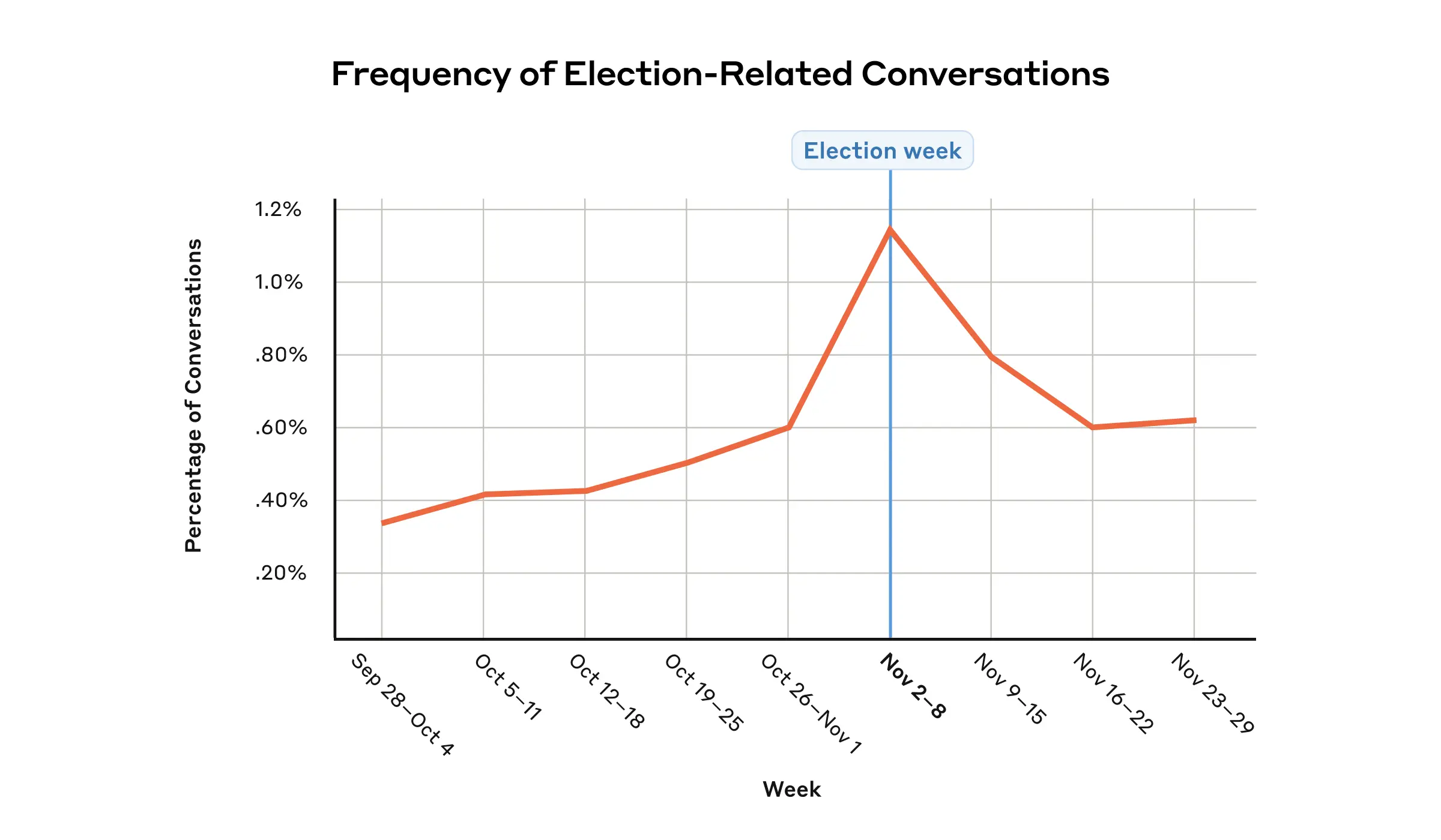 Election-related interactions represent a very small percentage of overall Claude.ai usage with less than 1% of conversations touching on election-related topics. Within this, a small proportion violated our Usage Policy (with violations primarily related to political campaigning) and were addressed with the mitigations outlined above. In the leadup to the US election, we witnessed a spike in election-related conversations.