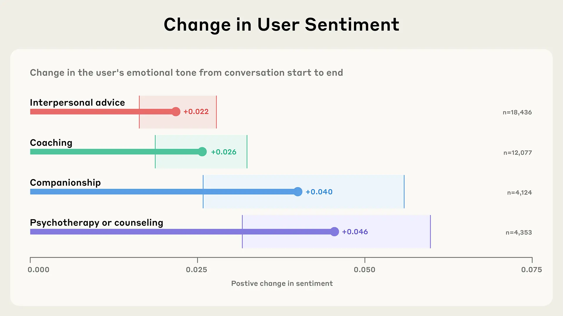 - People express increasing positivity over the course of conversations. In coaching, counseling, companionship, and interpersonal advice interactions, human sentiment typically becomes more positive over the course of conversations—suggesting Claude doesn't reinforce or amplify negative patterns.
