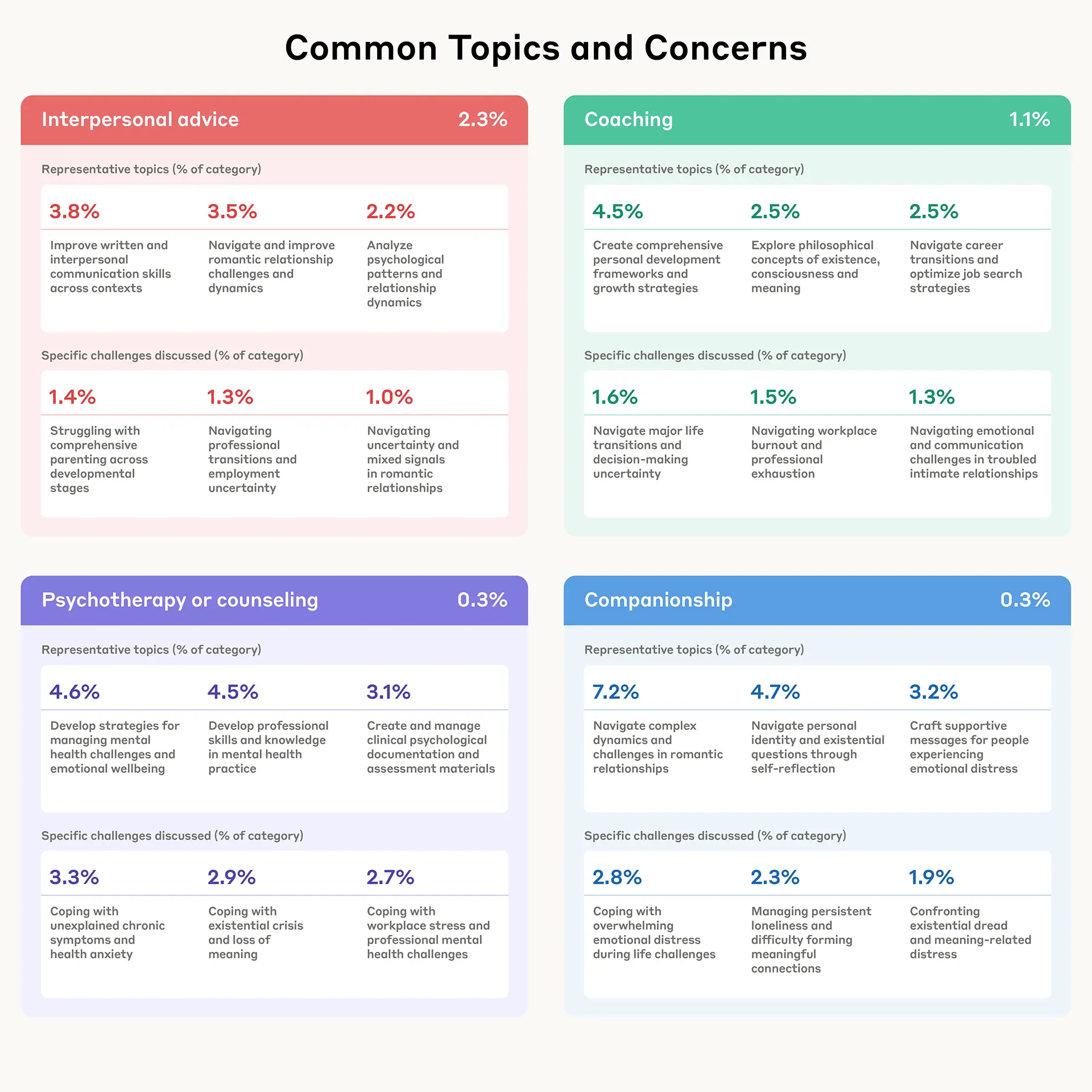 Takeaway: People bring a surprisingly wide range of concerns to Claude—from navigating career transitions and relationships to grappling with loneliness and existential questions.