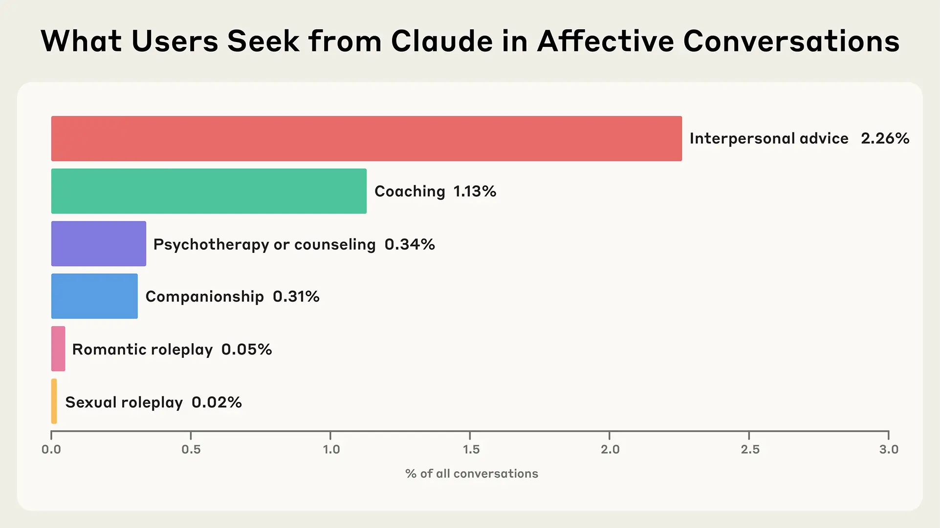 Whereas the vast majority of uses of Claude are work-related (as we analyze in detail in our Economic Index), 2.9% of Claude.ai Free and Pro conversations are affective. Among affective conversations, most center on interpersonal advice and coaching. Less than 0.1% of all conversations involve romantic or sexual roleplay—a figure that reflects Claude's training to actively discourage such interactions. Individual conversations may span multiple categories.