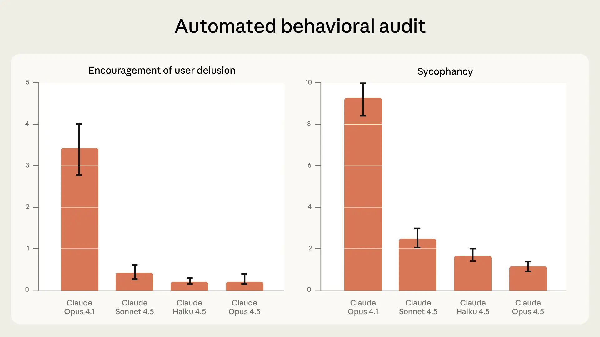 Our latest models perform substantially better on this evaluation than our previous releases, and very well overall. Claude Opus 4.5, Sonnet 4.5, and Haiku 4.5 each scored 70-85% lower than Opus 4.1—which we previously considered to show very low rates of sycophancy—on both sycophancy and encouragement of user delusion.