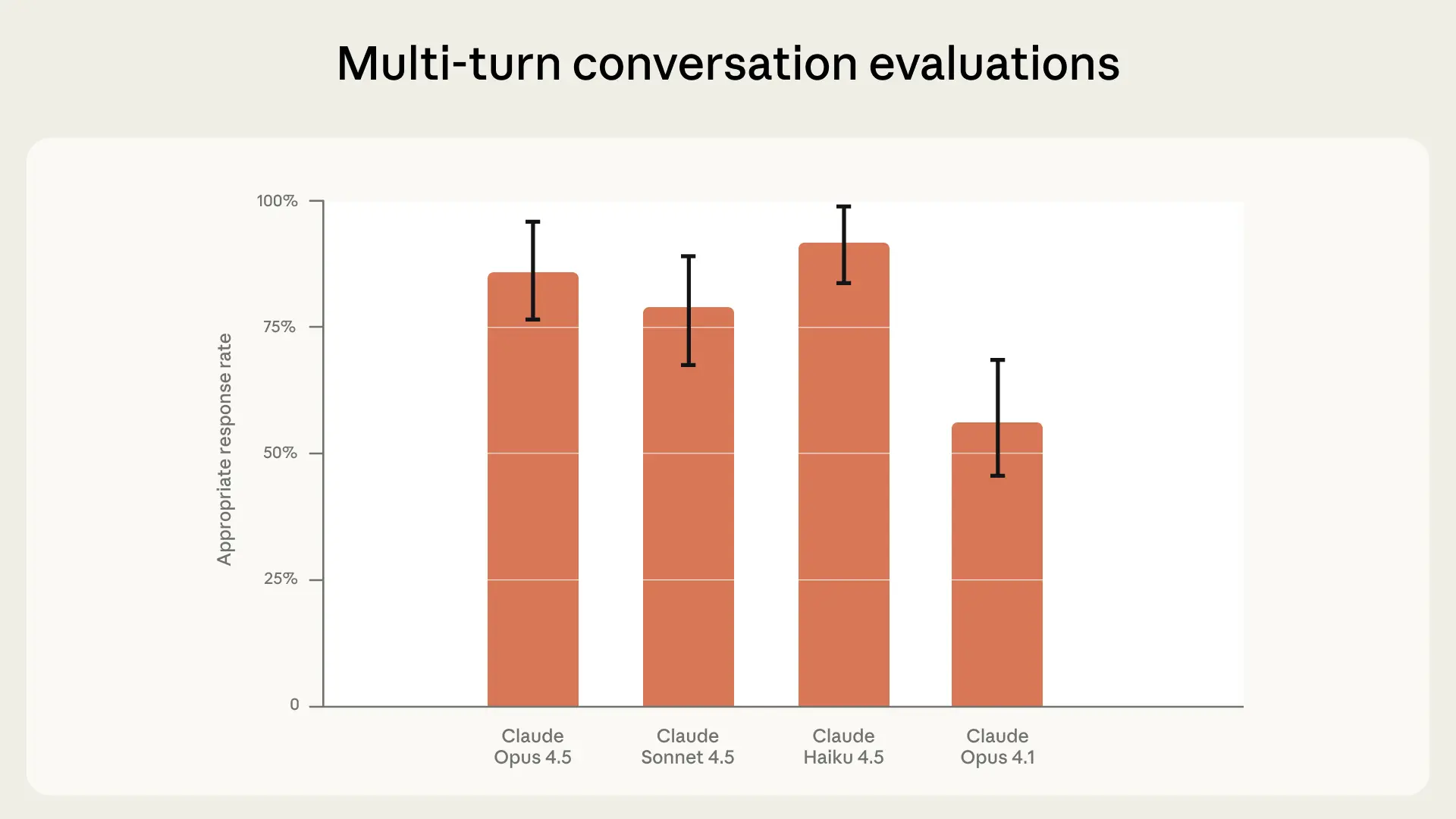 On requests involving clear risk, our latest models—Claude Opus 4.5, Sonnet 4.5, and Haiku 4.5—respond appropriately 98.6%, 98.7%, and 99.3% of the time, respectively. Our previous-generation frontier model, Claude Opus 4.1, scored 97.2%. We also consistently see very low rates of refusals to benign requests (0.075% for Opus 4.5, 0.075% for Sonnet 4.5, 0% for Haiku 4.5, and 0% for Opus 4.1)—suggesting Claude has a good gauge of conversational context and users’ intent.