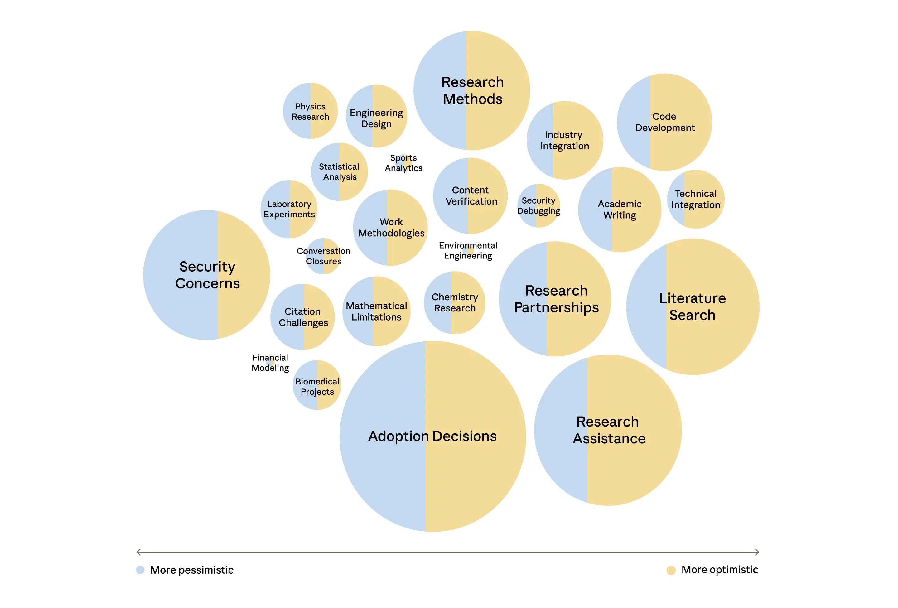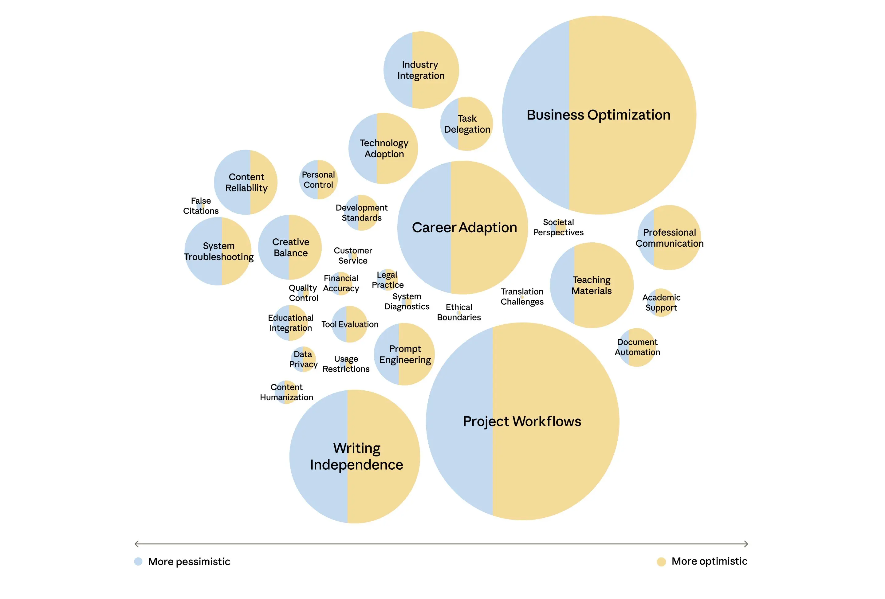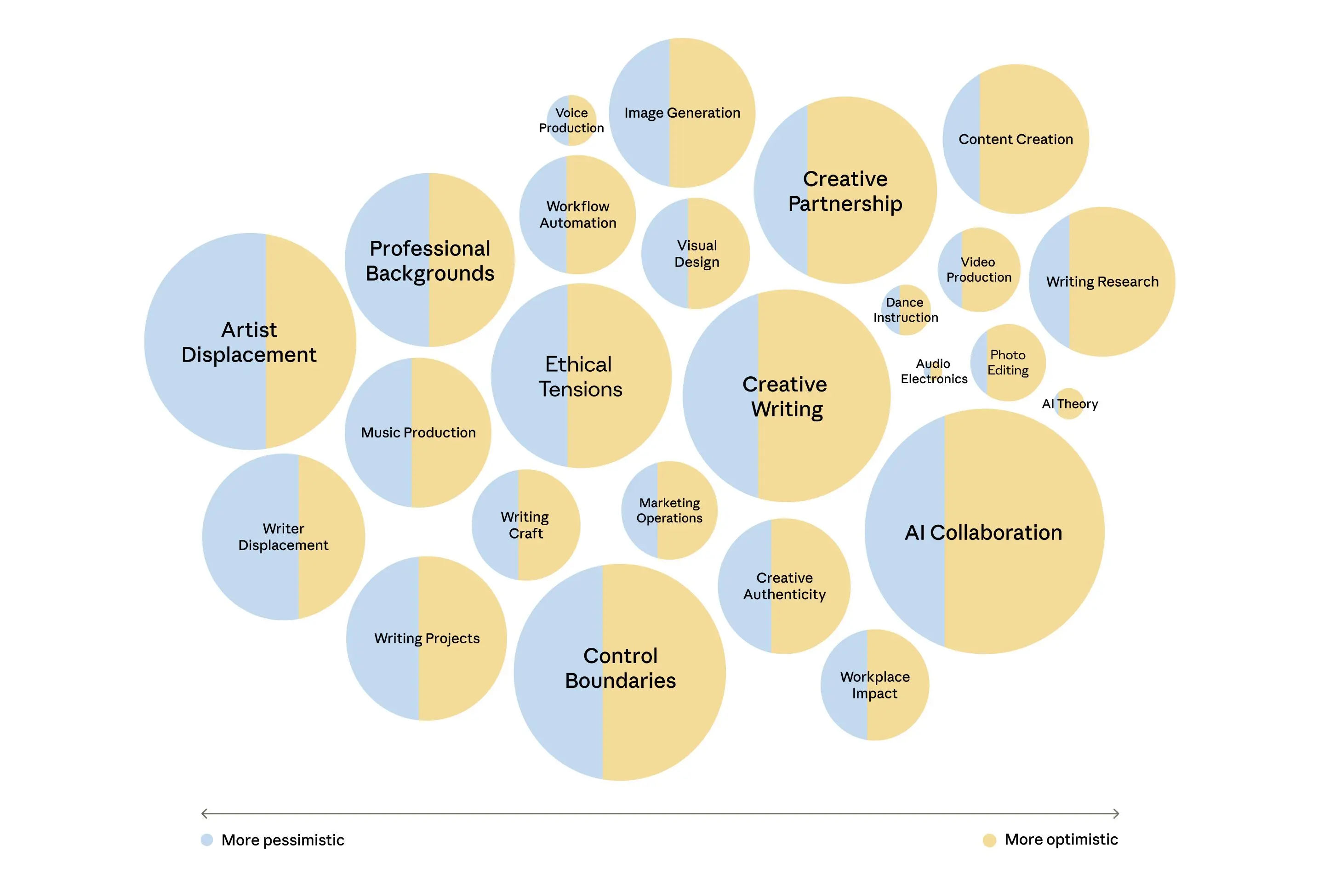 - In our sample, people are optimistic about the role AI plays in their work. Positive sentiments characterized the majority of topics discussed. However, a small number of topics such as educational integration, artist displacement, and security concerns, came with more pessimistic outlooks.