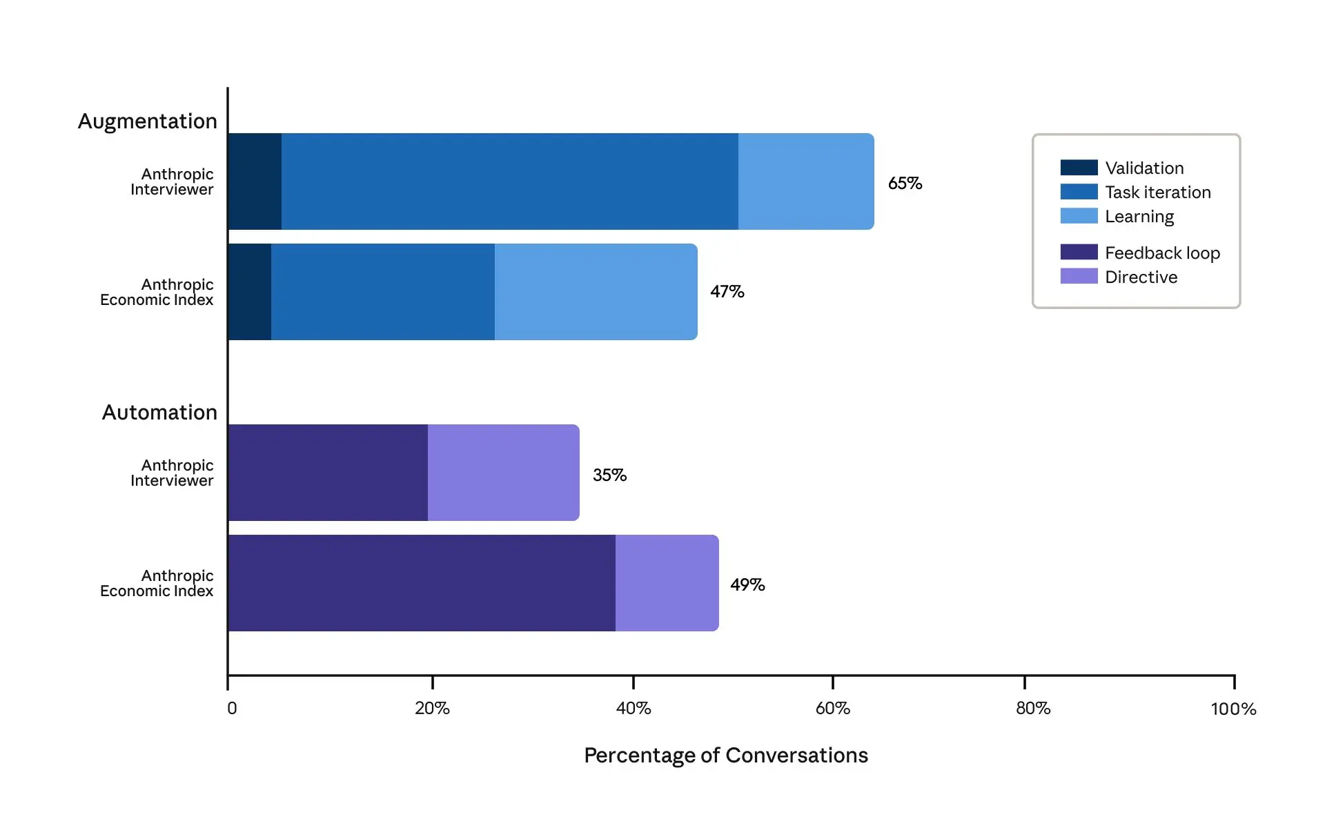 In a previous analysis, we categorized AI uses into either augmentation (where AI collaborates with a user to perform a task), or automation (where AI directly performs tasks). In the Anthropic Interviewer data, 65% of participants described AI’s primary role as augmentative; 35% described it as automative. Notably, this differed from our latest analysis of how people use Claude, which showed a much more even split: 47% of tasks involved augmentation and 49% automation. There are multiple potential explanations for this difference: