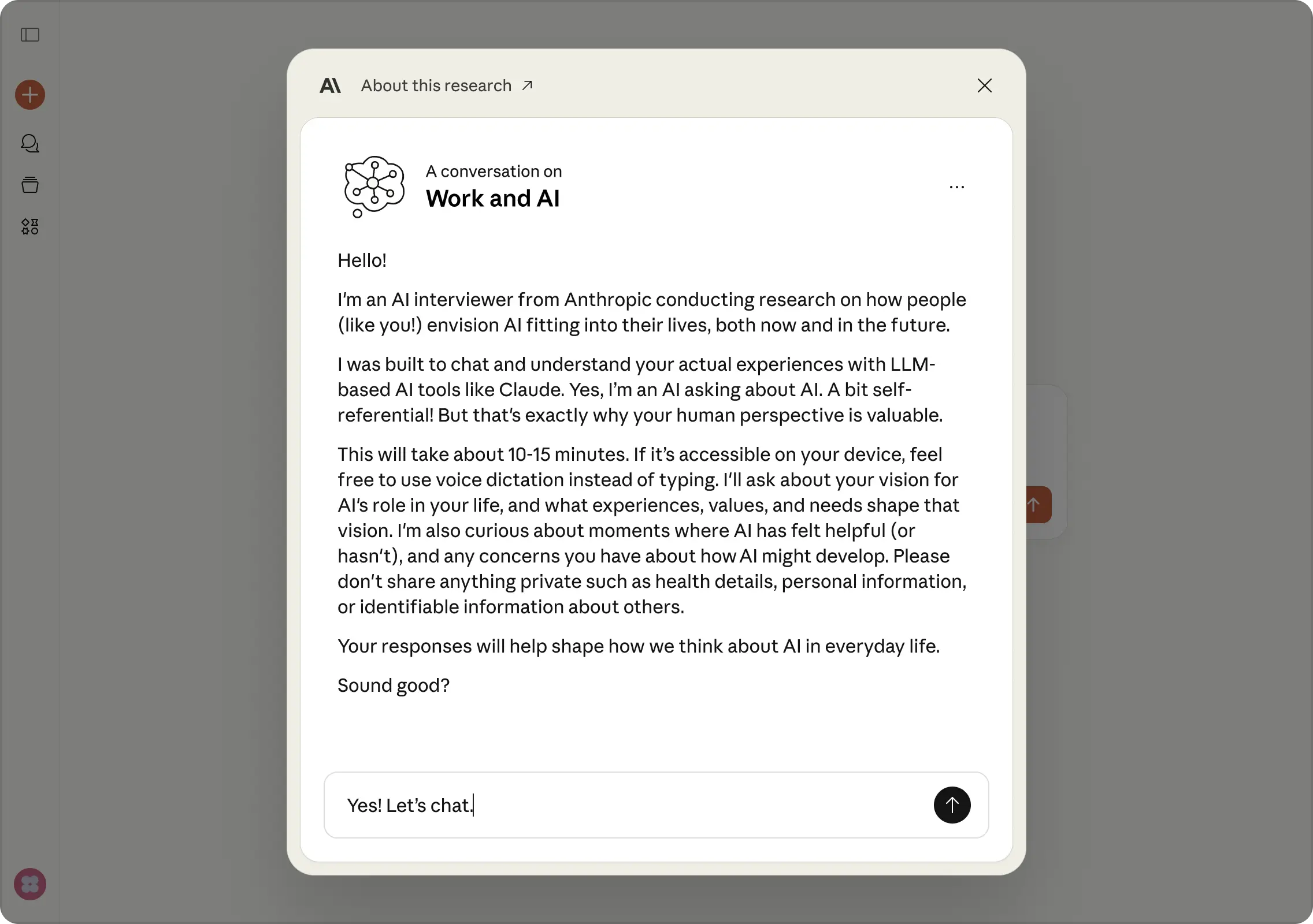 We will use Anthropic Interviewer to ask you about your vision for AI's role in your life, what experiences, values, and needs shape this, as well as what might help or hinder that vision.