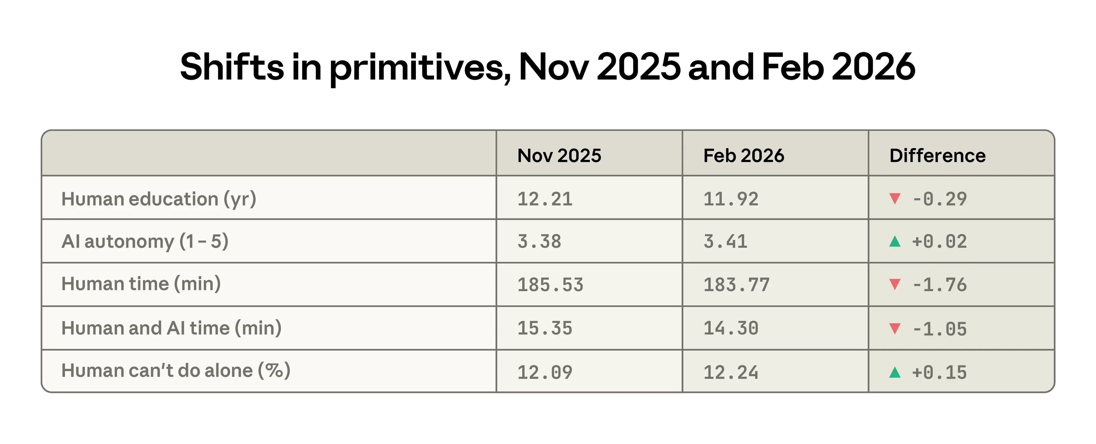 While slight, changes in several primitives between the previous and current report capture similar declines in task complexity on Claude.ai. The average years of education required for the human inputs declined from 12.2 to 11.9 years, users granted more autonomy to the AI, and the time required for the human to do the task alone fell by about 2 minutes. One change goes ostensibly in the opposite direction: the tasks performed by Claude were judged to be slightly less possible for a human without access to AI.