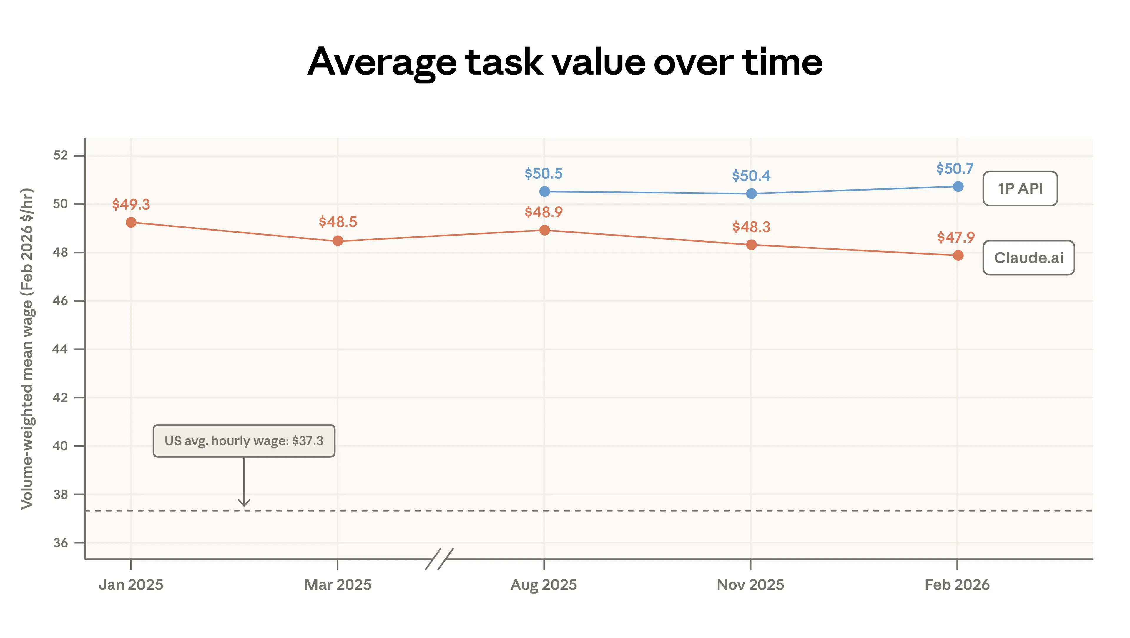 Another way to measure the change in the mix of tasks done on Claude is to look at the change in the average value of tasks, which we define as the average hourly wage of US workers who perform that task (Figure 1.4).6 This estimate of the value of tasks in Claude.ai has dropped slightly from $49.3 to $47.9 mostly due to an increase in simple factual questions (e.g., sports outcomes, weather) and a decrease in coding as it shifts to the API. As mentioned in our previous report, the tasks we see on Claude tend to require higher education. The plot shows that these tasks also tend to earn higher wages than the US national average.