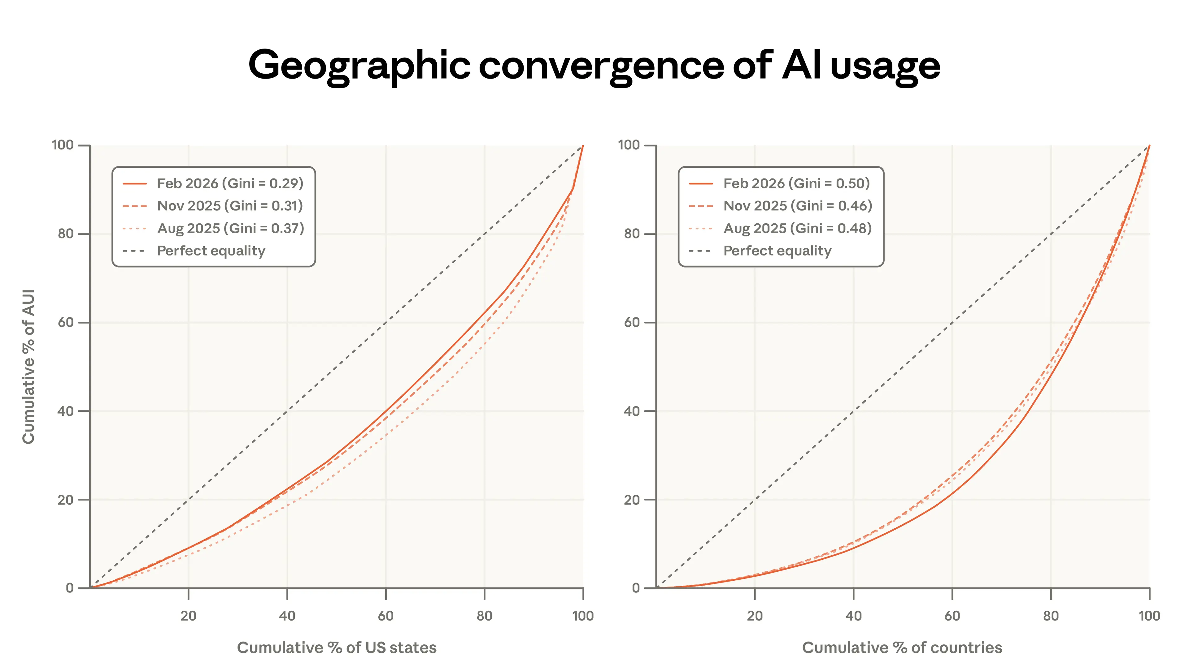 The left panel of Figure 1.6 shows that this convergence continued in our most recent data, but at a slower pace. From August 2025 to February 2026, the share of per-person usage going to the top five states has decreased from 30 to 24%. The Gini coefficient has fallen since August 2025, though the pace of convergence has slowed. When we update our estimates from the previous report, we find that at this rate states would arrive at roughly equal usage per capita in 5–9 years, rather than 2–5.8
