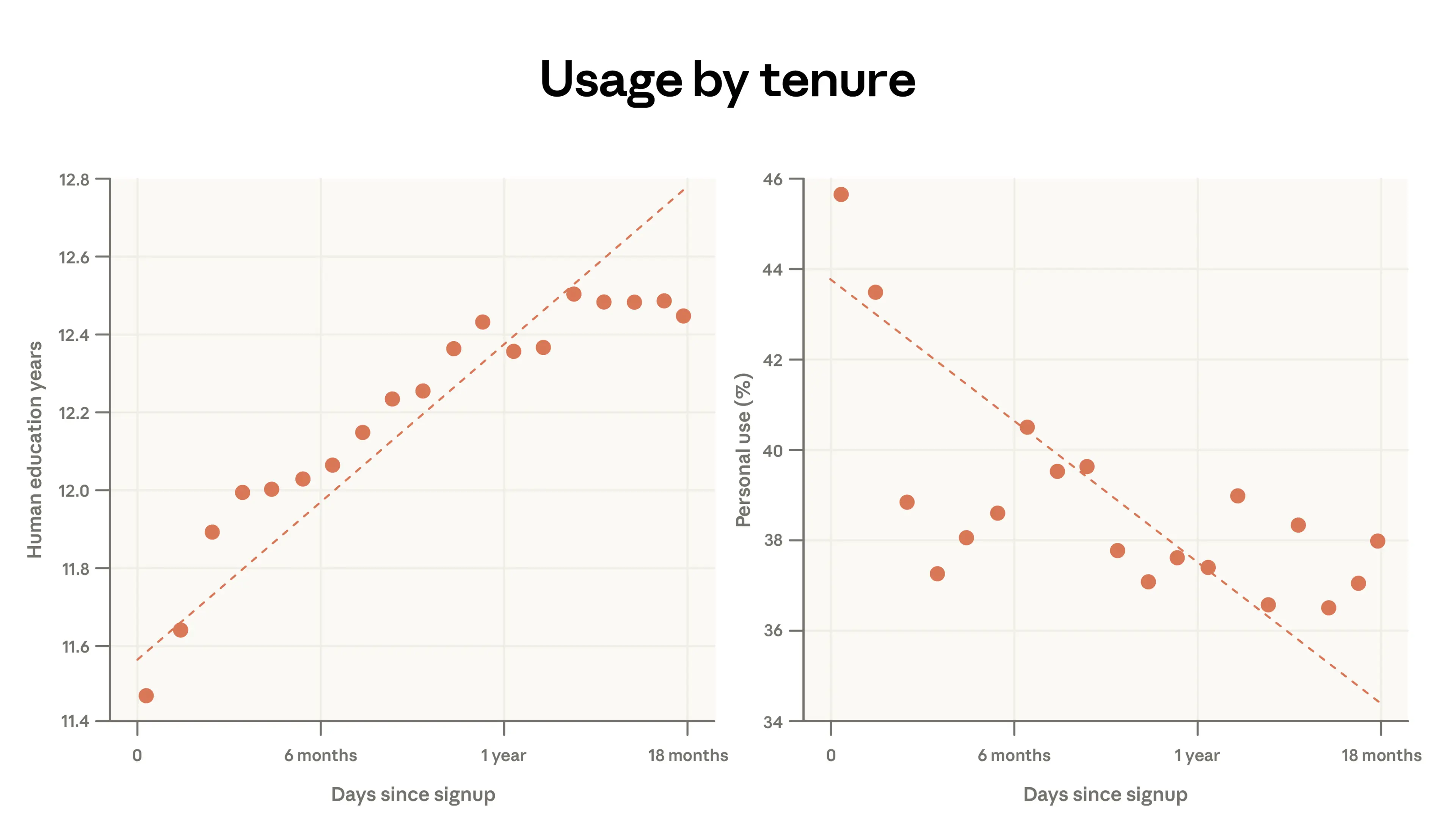 In the panel on the left, we show that the years of schooling needed to understand the human prompt increases by almost 1 year for every additional year of Claude usage. In the panel on the right, we show that at the same time, personal use decreases: people who signed up a year ago devote 38% of their conversations to personal use cases, compared to 44% for the newest users.