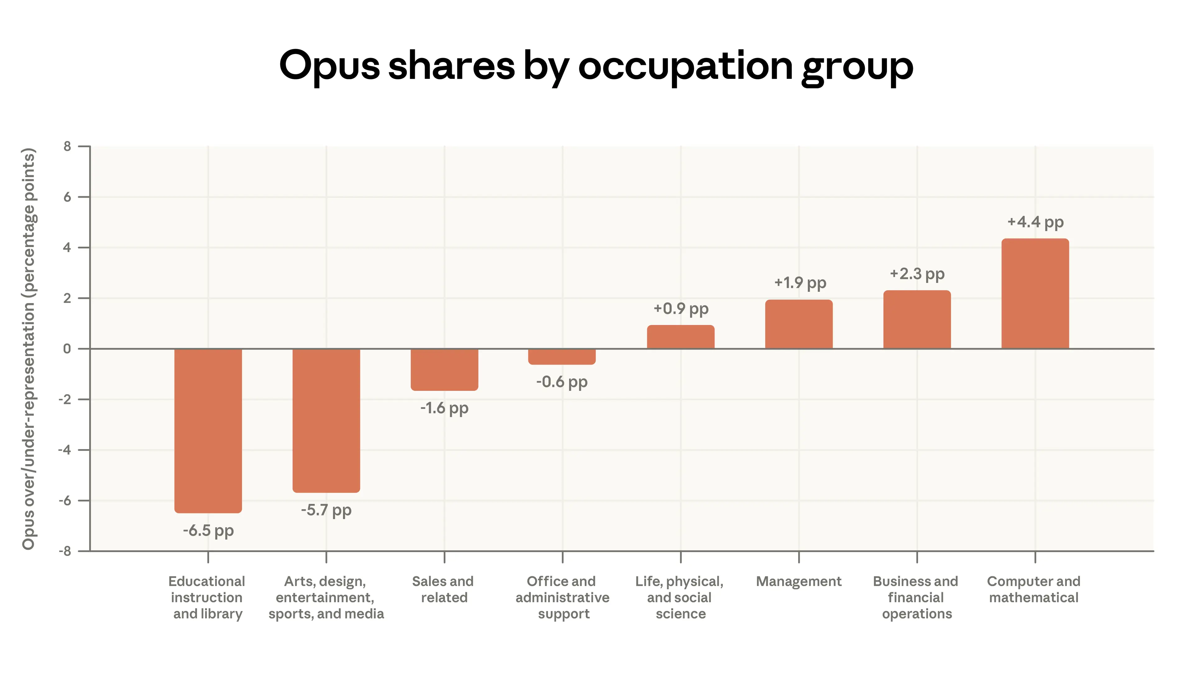 - Model selection matches the task. We show that users choose our most intelligent model class, Opus, for tasks that normally receive higher wages in the labor market. For example, among paying Claude.ai users, Opus is used 4 percentage points more than average for coding tasks and 7 percentage points less than average for tutoring-related tasks. This model switching is about twice as stark for API users.