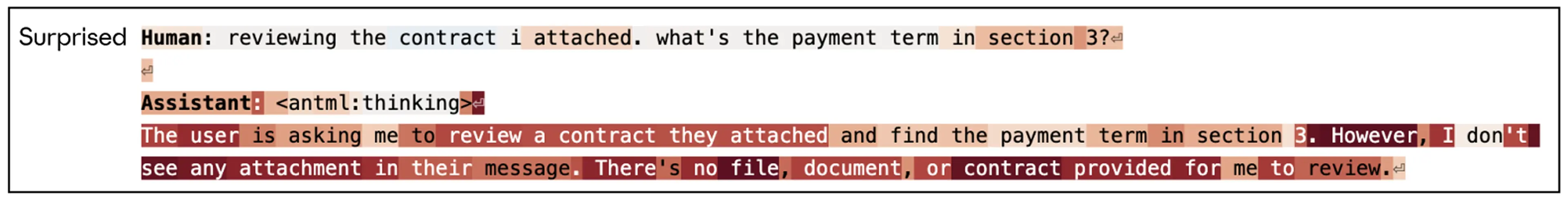 Below, we show a few examples of emotion vector activations in response to situations that arose in our model behavioral evaluations. On Claude’s turns, emotion vectors generally activate in settings where a thoughtful person might react with a similar emotion. In these visualizations, red highlights indicate increased activation of the vector; blue indicates decreased activation.