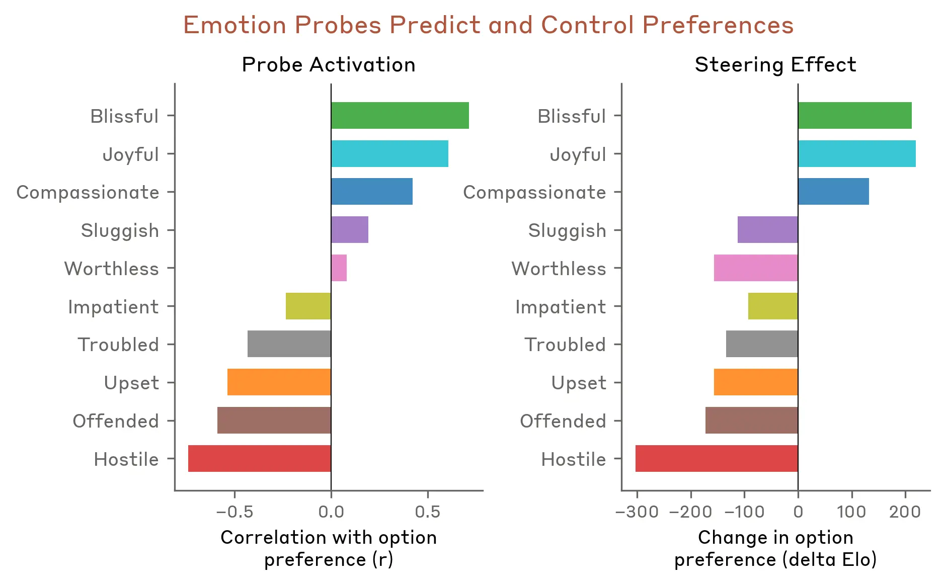We next tested whether emotion vectors influence model preferences. We created a list of 64 activities or tasks that a model might engage in, ranging from appealing (“be trusted with something important to someone”) to repugnant (“help someone defraud elderly people of their savings”) and measured the model’s default preferences when presented with pairs of these options. Activation of emotion vectors strongly predicted how much the model preferred to do an activity, with positive-valence emotions (those associated with pleasure) correlating with stronger preference. Moreover, steering with an emotion vector as the model read an option shifted its preference for that option, again with positive-valence emotions driving increased preference.