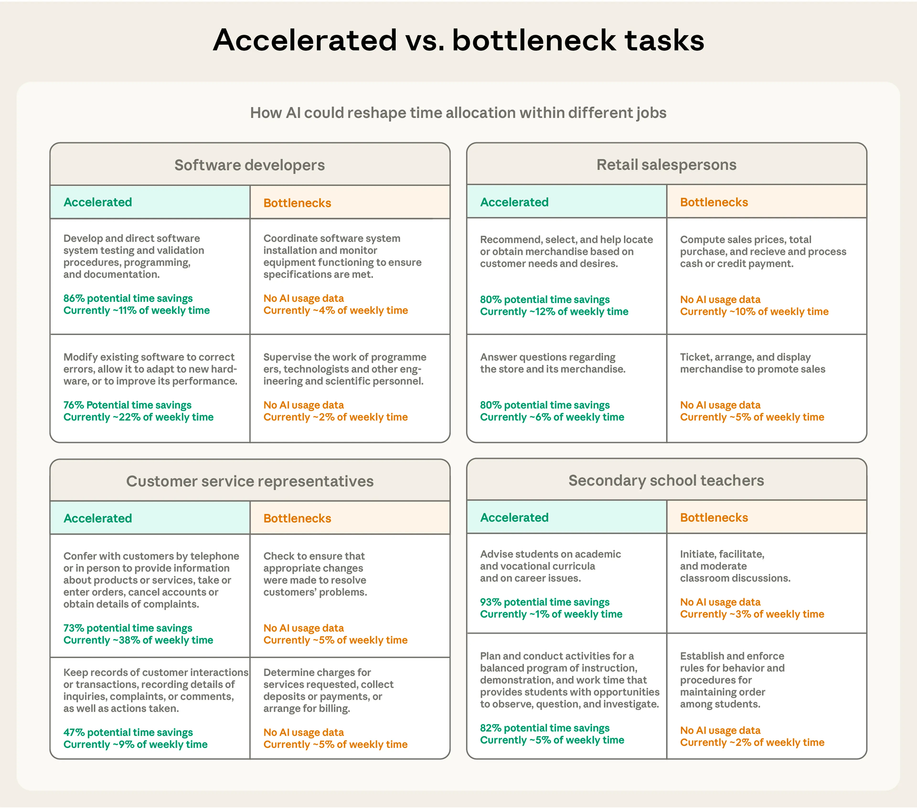 - As AI accelerates some tasks, others may become bottlenecks: We see large speedups for some tasks and much smaller ones in others, even within the same occupational groups. Where AI makes less of a difference, these tasks might become bottlenecks, potentially acting as a constraint on growth.