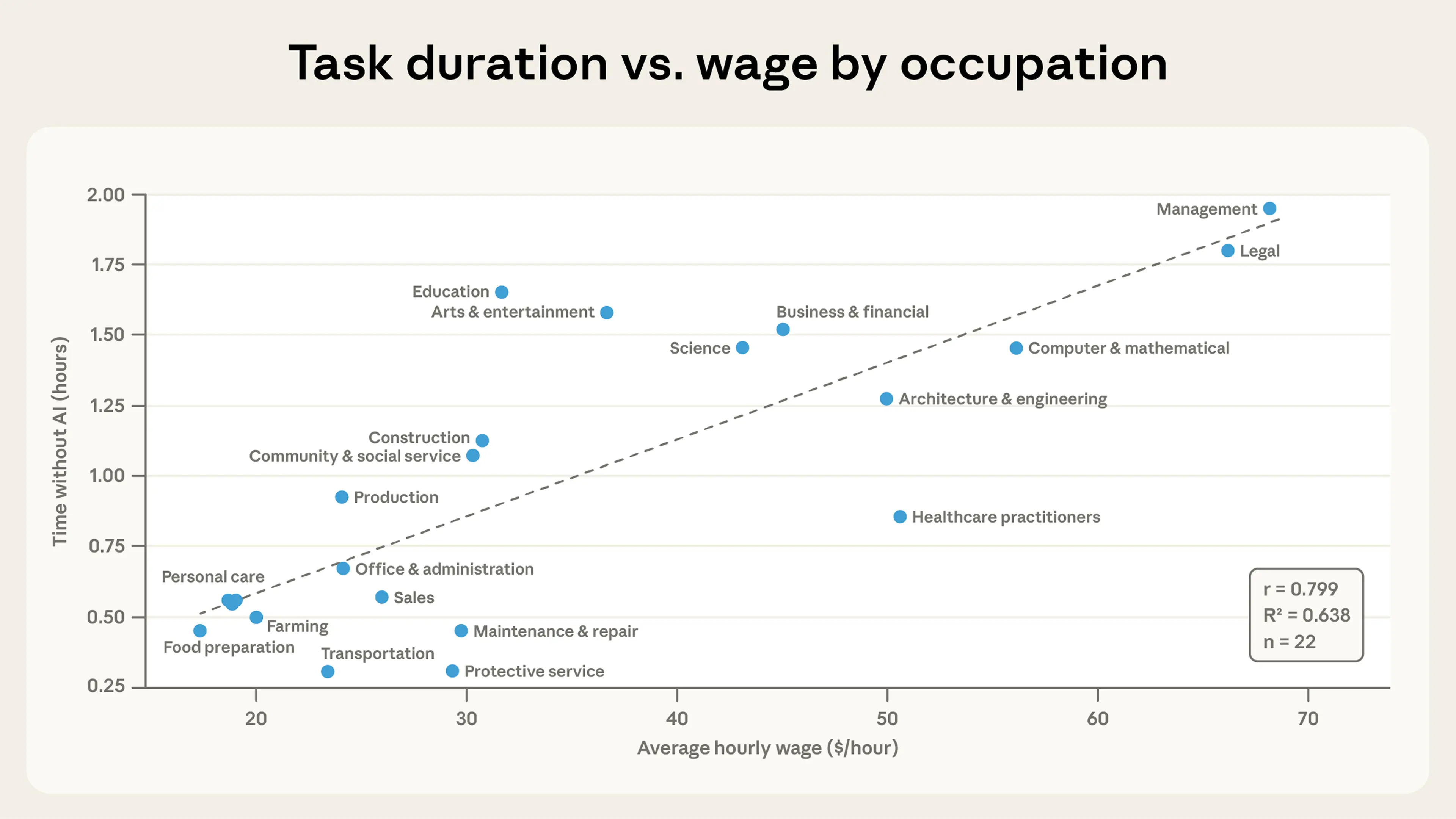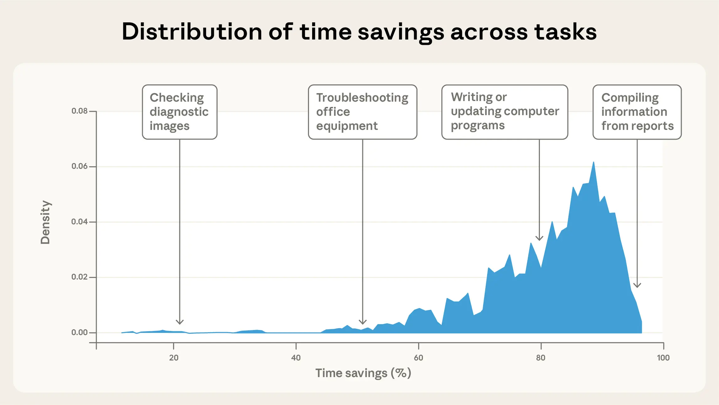 Not only that, but as model capabilities improve, we want to understand whether they do higher-value work. To understand how AI is reshaping work and productivity, we need to know not just which tasks Claude handles, but how substantial those tasks and time savings are.