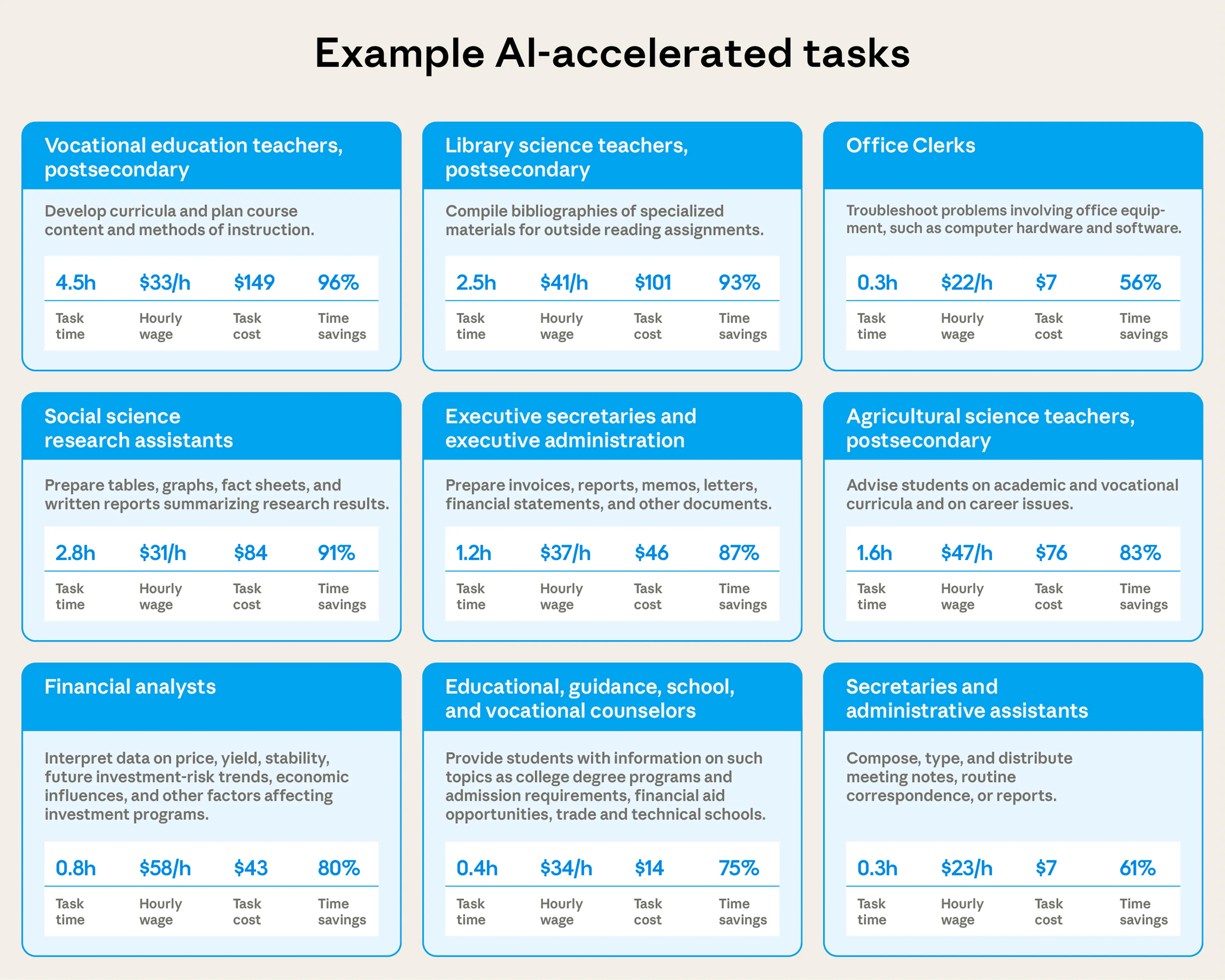 Looking at individual tasks within occupations provides concrete examples of where and how AI might be delivering time savings. At the most extreme end, we see users complete curriculum development tasks that Claude thinks would take 4.5 hours in just 11 minutes. Such tasks have an implied labor cost of $115 based on the average hourly wage of teachers.