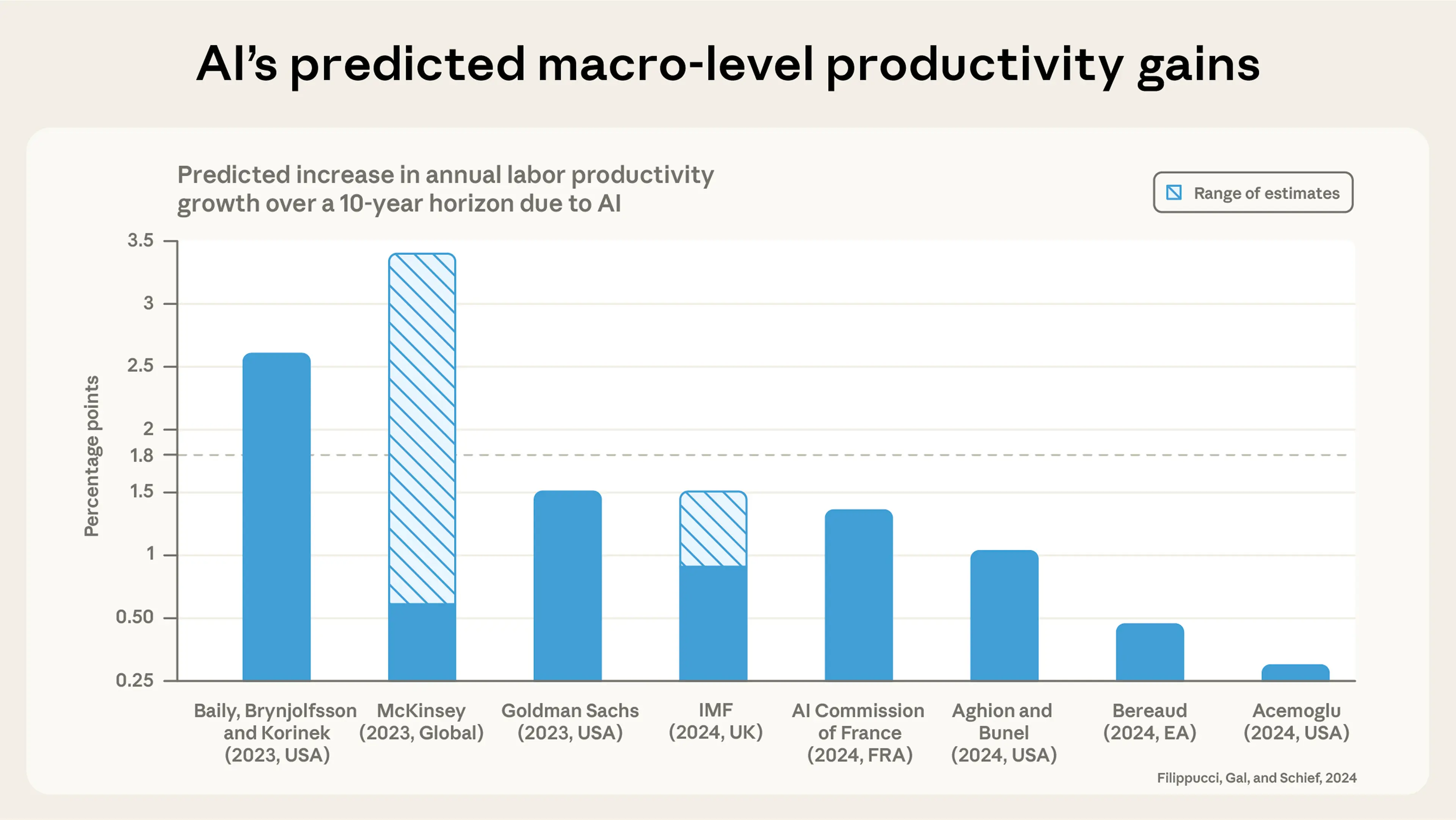 - Extrapolating these results to the economy, current generation AI models could increase annual US labor productivity growth by 1.8% over the next decade. This would double the annual growth the US has seen since 2019, and places our estimate towards the upper end of recent estimates. Taking as given Claude’s estimates of task-level efficiency gains, we use standard methods to calculate a 1.8% implied annual increase in US labor productivity over the next ten years. However, this estimate does not account for future improvements in AI models (or more sophisticated uses of current technology), which could significantly magnify AI’s economic impact.