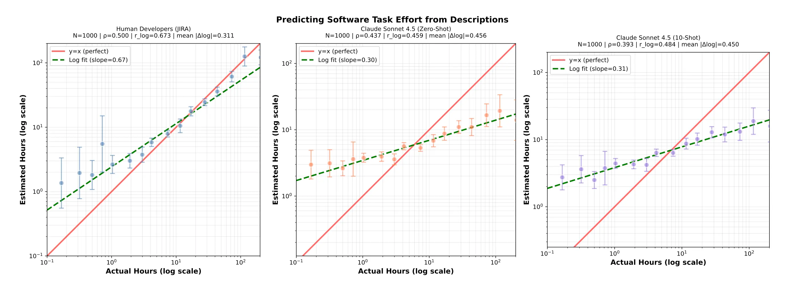 - Claude Sonnet 4.5 with ten examples of tasks and their ground-truth time lengths showed a worse ρ=0.39, but improved r_log=0.48