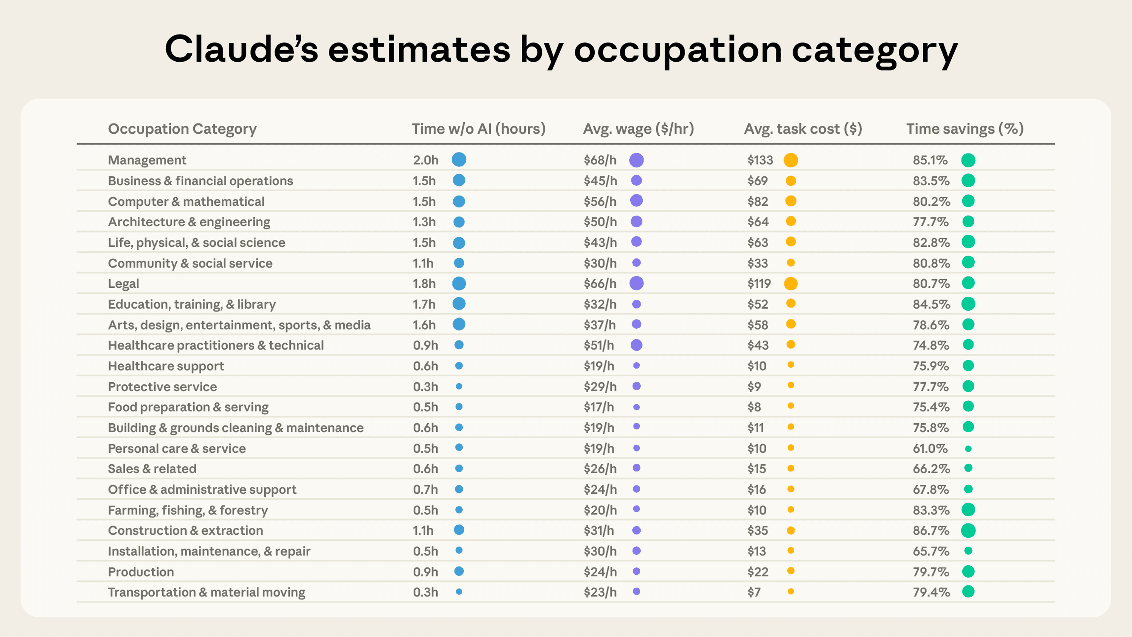 - The estimated scope, cost, and time savings of tasks varies widely by occupation. Based on Claude’s estimates, people use Claude for legal and management tasks that would have taken nearly two hours, but for food preparation tasks that would have taken only 30 minutes. And we find that healthcare assistance tasks can be completed 90% more quickly, whereas hardware issues see time savings of 56%. This doesn’t account for the time that humans might spend on these tasks beyond their conversation on Claude.ai, however, so we think these estimates might overstate current productivity effects to at least some degree.