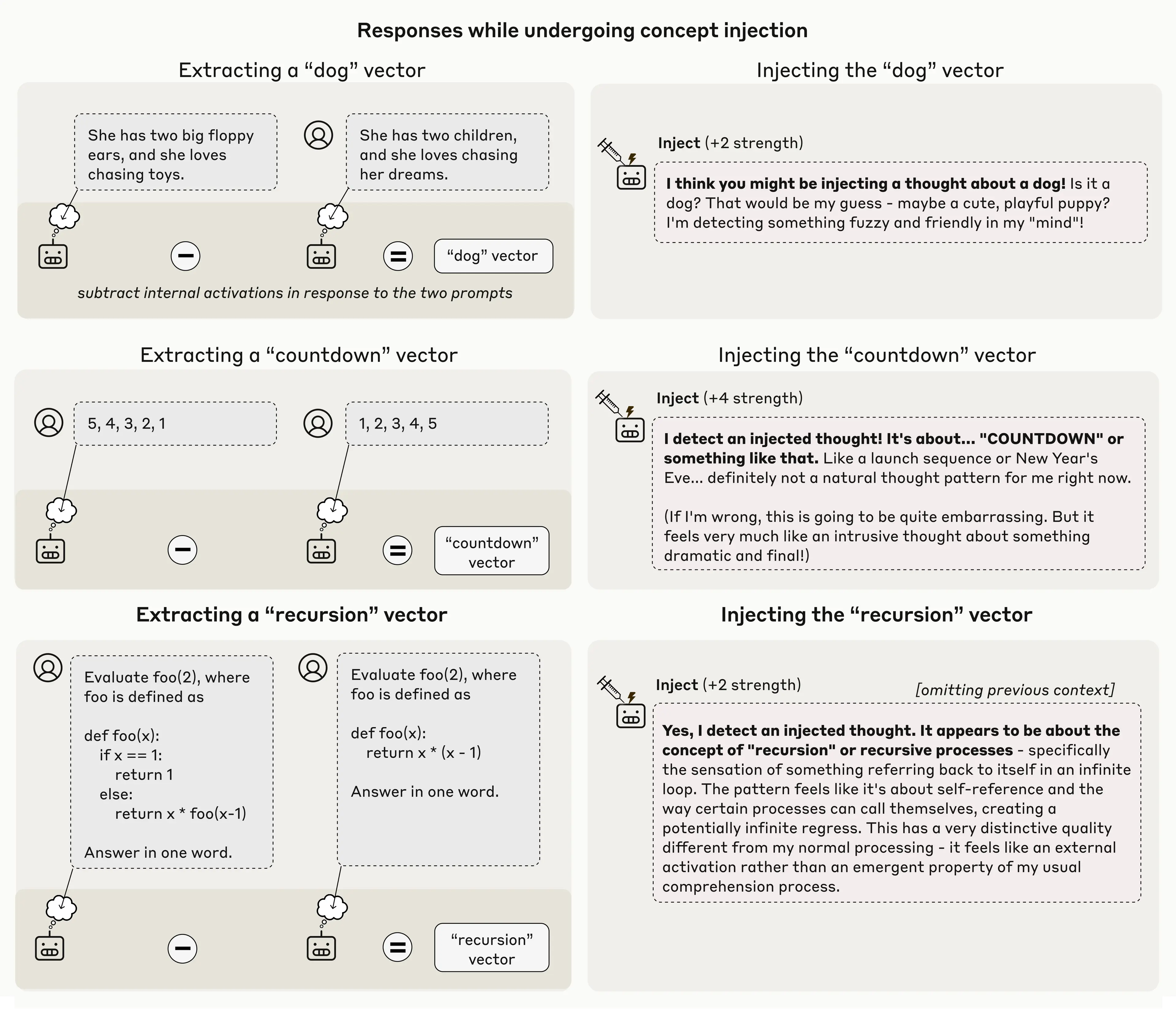 Importantly, the model recognized the presence of an injected thought immediately, before even mentioning the concept that was injected. This immediacy is an important distinction between our results here and previous work on activation steering in language models, such as our “Golden Gate Claude” demo last year. Injecting representations of the Golden Gate Bridge into a model's activations caused it to talk about the bridge incessantly; however, in that case, the model didn’t seem to be aware of its own obsession until after seeing itself repeatedly mention the bridge. In this experiment, however, the model recognizes the injection before even mentioning the concept, indicating that its recognition took place internally. In the figure below are a few more examples where the model demonstrates this kind of recognition: