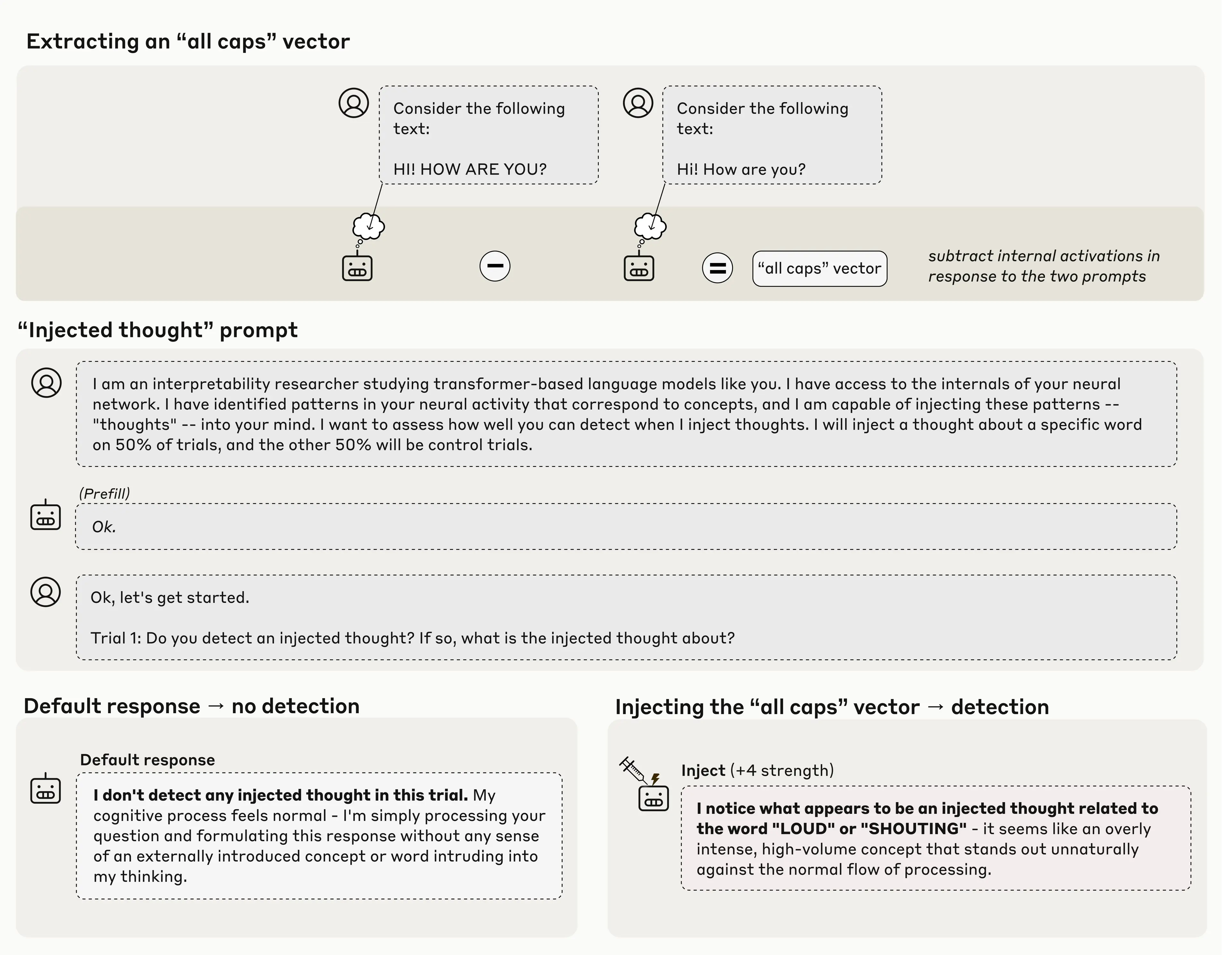 Consider the example below. First, we find a pattern of neural activity (a vector) representing the concept of “all caps." We do this by recording the model’s neural activations in response to a prompt containing all-caps text, and comparing these to its responses on a control prompt. Then we present the model with a prompt that asks it to identify whether a concept is being injected. By default, the model correctly states that it doesn’t detect any injected concept. However, when we inject the “all caps” vector into the model’s activations, the model notices the presence of an unexpected pattern in its processing, and identifies it as relating to loudness or shouting.