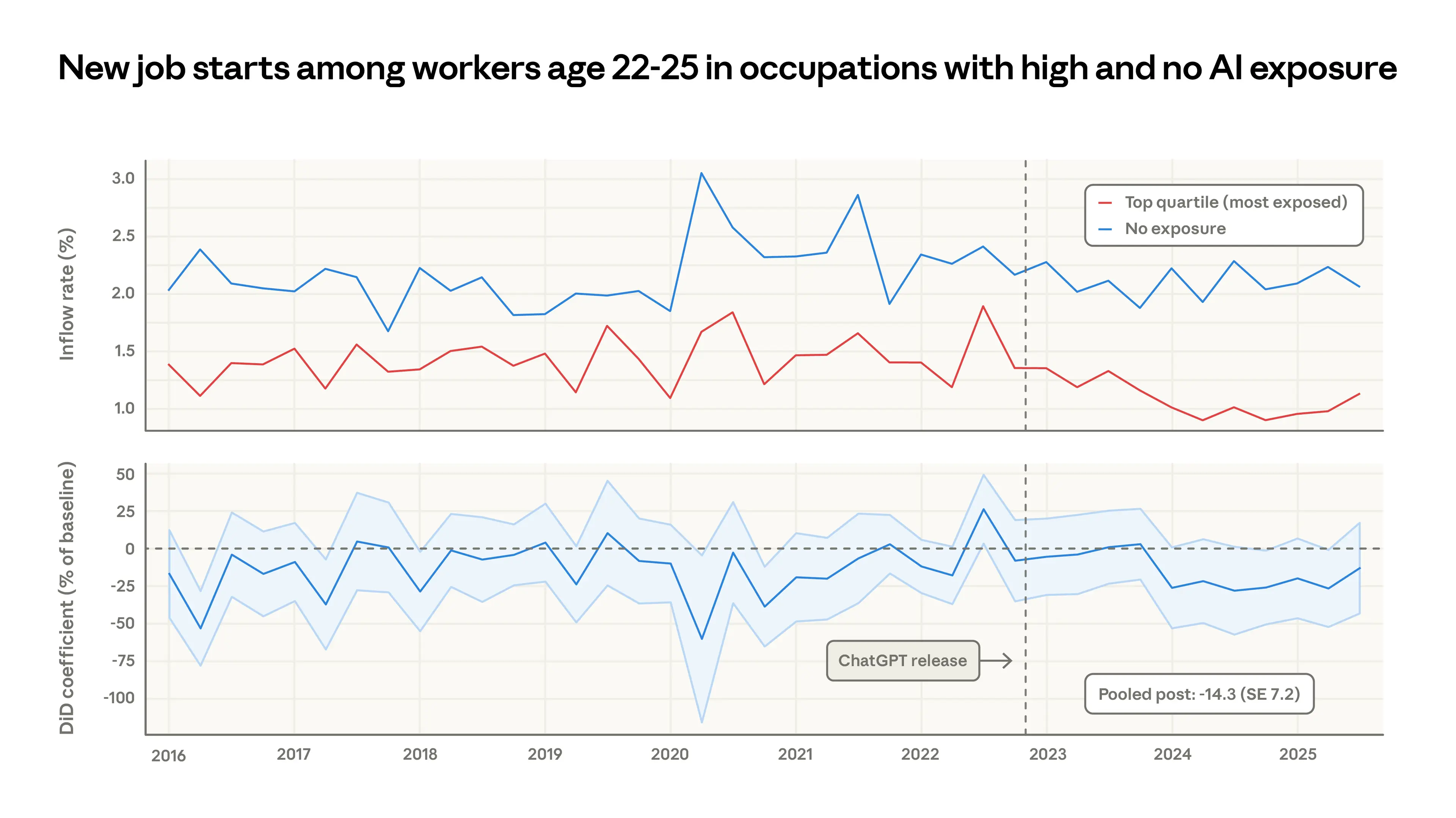 One group of particular concern is young workers. Brynjolfsson et al. report a 6—16% fall in employment in exposed occupations among workers aged 22 to 25. They attribute this decrease primarily to a slowdown in hiring rather than an increase in separations.9