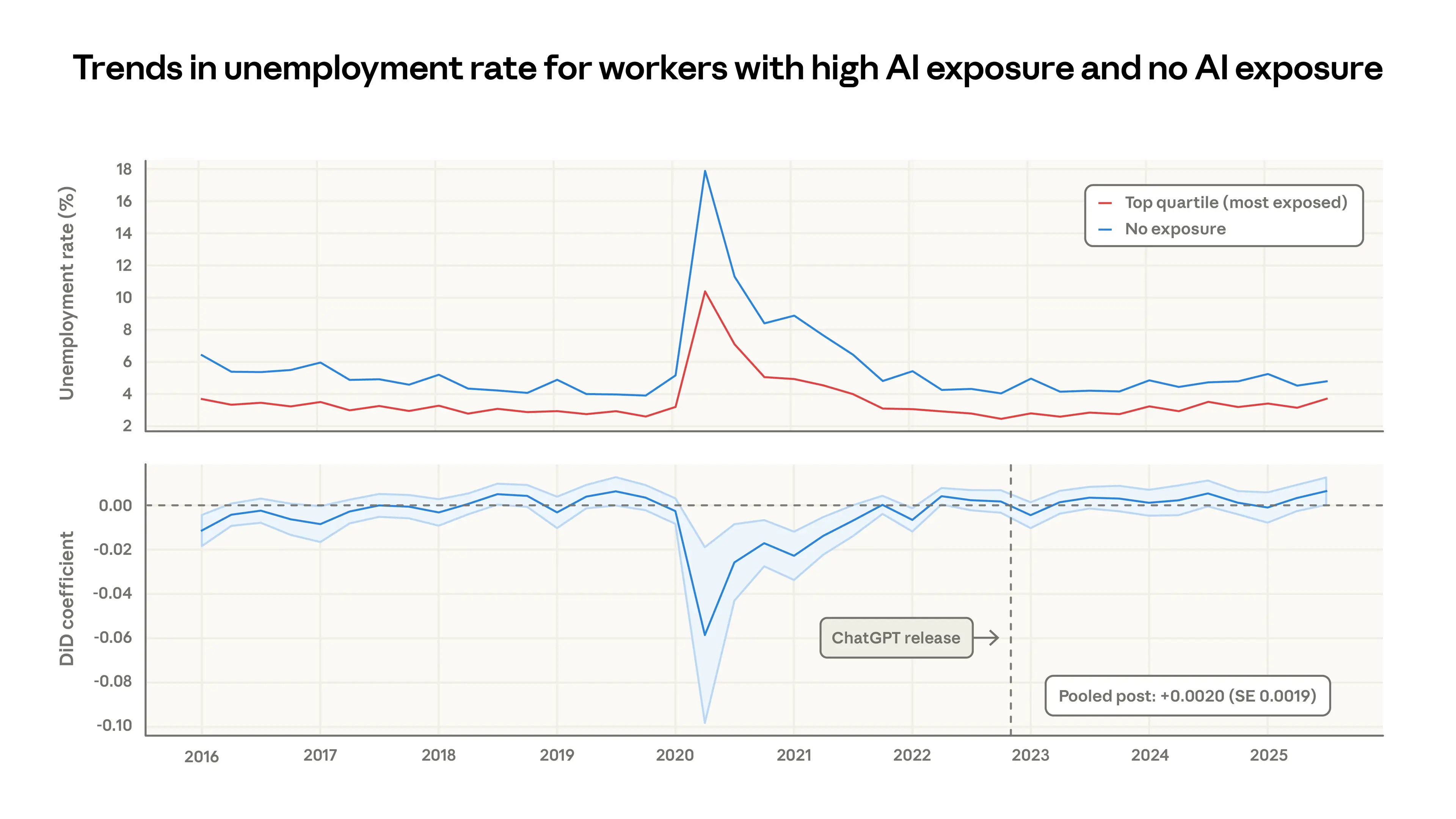 This report introduces a new measure for understanding the labor market effects of AI and studies impacts on unemployment and hiring. Jobs are more exposed to AI to the extent that their tasks are theoretically feasible with LLMs and observed on our platforms in automated, work-related use cases. We find that computer programmers, customer service representatives, and financial analysts are among the most exposed. Using survey data from the US, we find no impact on unemployment rates for workers in the most exposed occupations, although there’s tentative evidence that hiring into those professions has slowed slightly for workers aged 22-25.