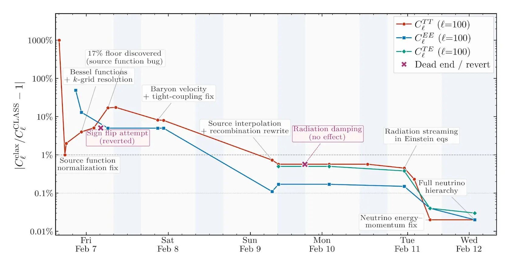 Claude worked on the project from scratch over a few days, reaching sub-percent agreement with the reference CLASS implementation across its various outputs. I asked Claude to reconstruct the accuracy of some of the main outputs of the code—the various CMB angular power spectra—over the course of the project, also labeling milestones during development. It produced the plot below, illustrating the path to sub-percent accuracy.