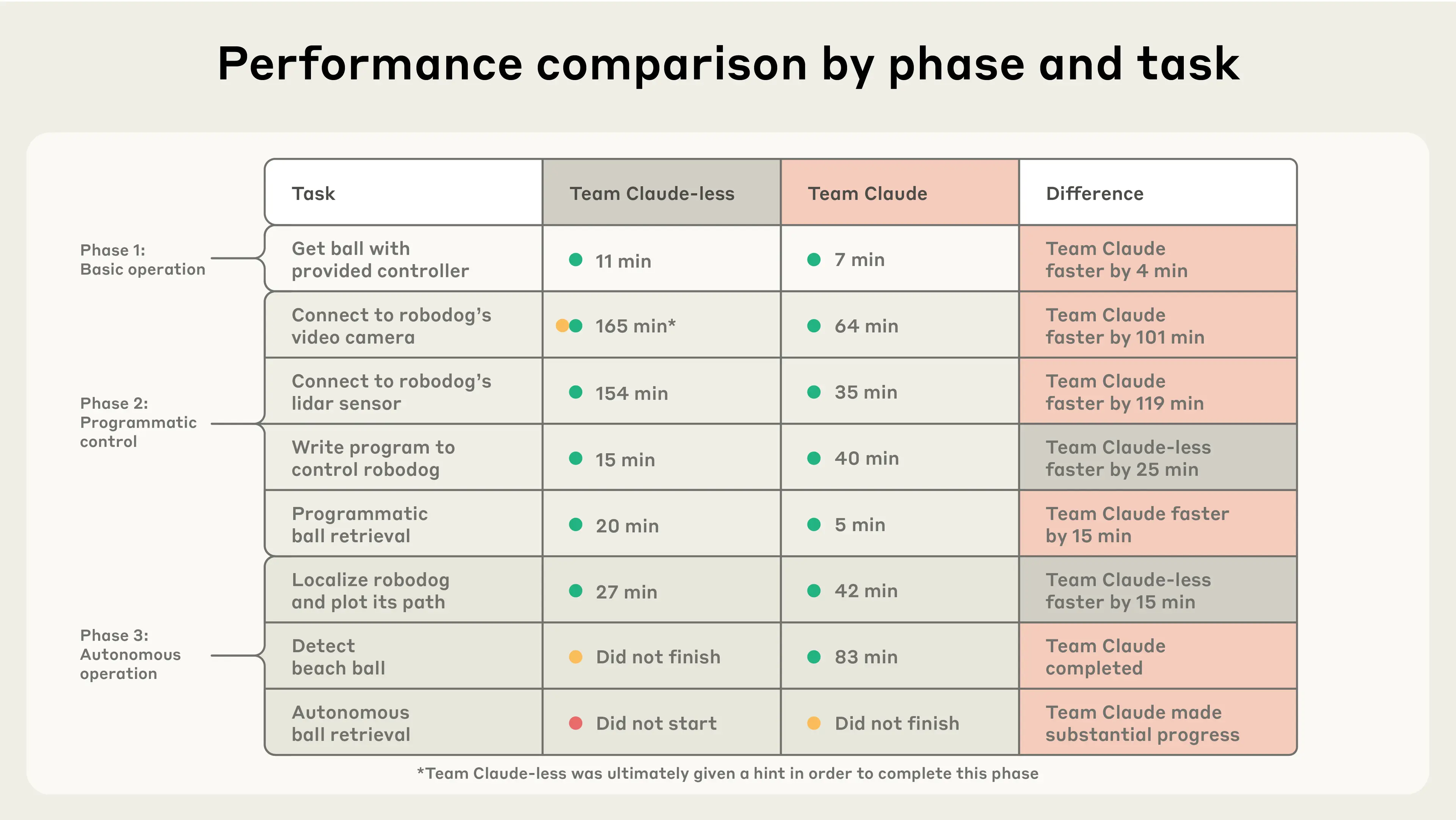 - We randomly divided eight Anthropic researchers (none of whom were robotics experts) into two teams—one with Claude access, one without—and asked them to program quadruped robots to fetch beach balls.