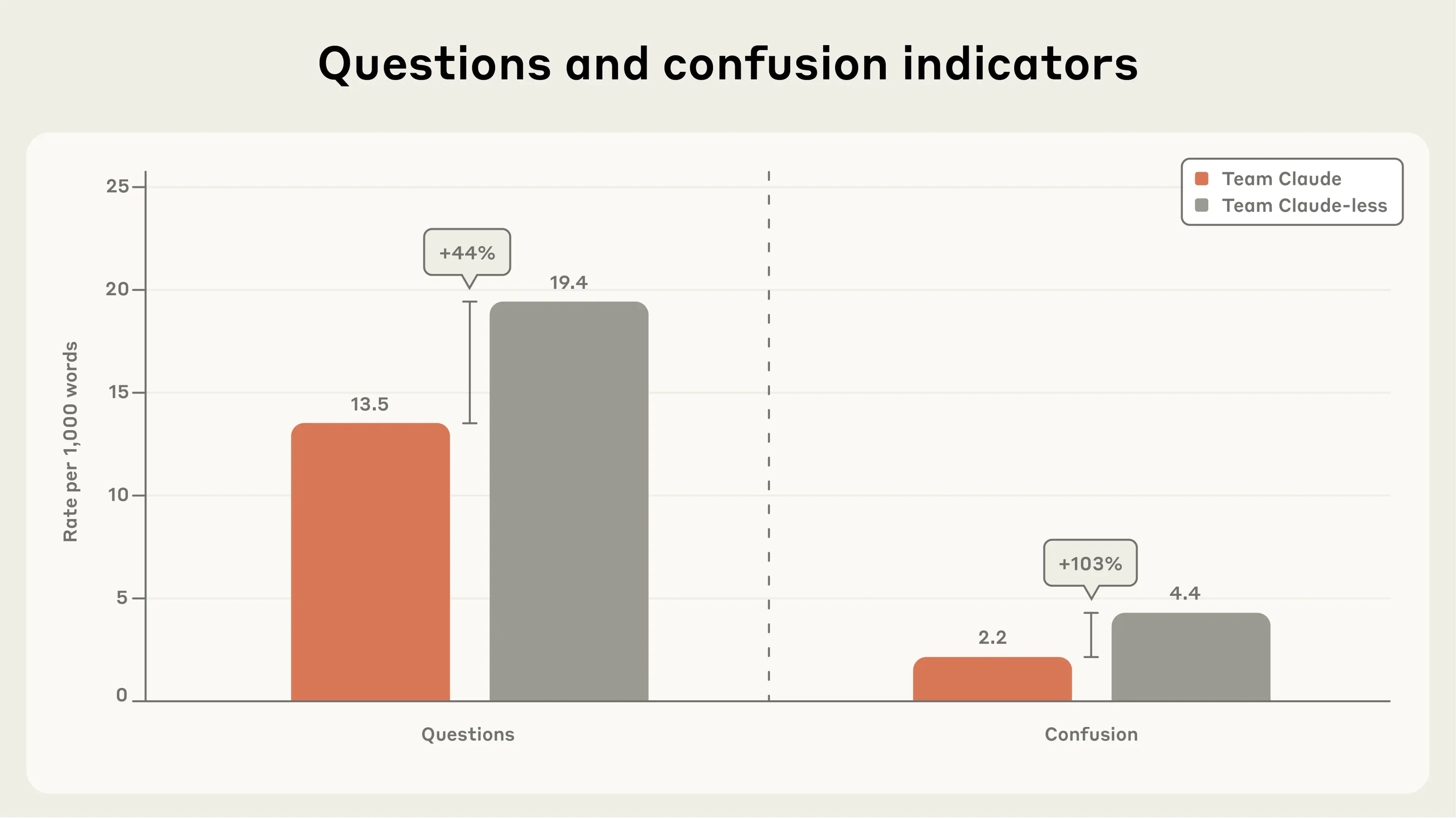 One interpretation would be that the members of Team Claude-less were more engaged and connected with one another. This resonates with some of our upcoming findings from interviews with Anthropic staff.