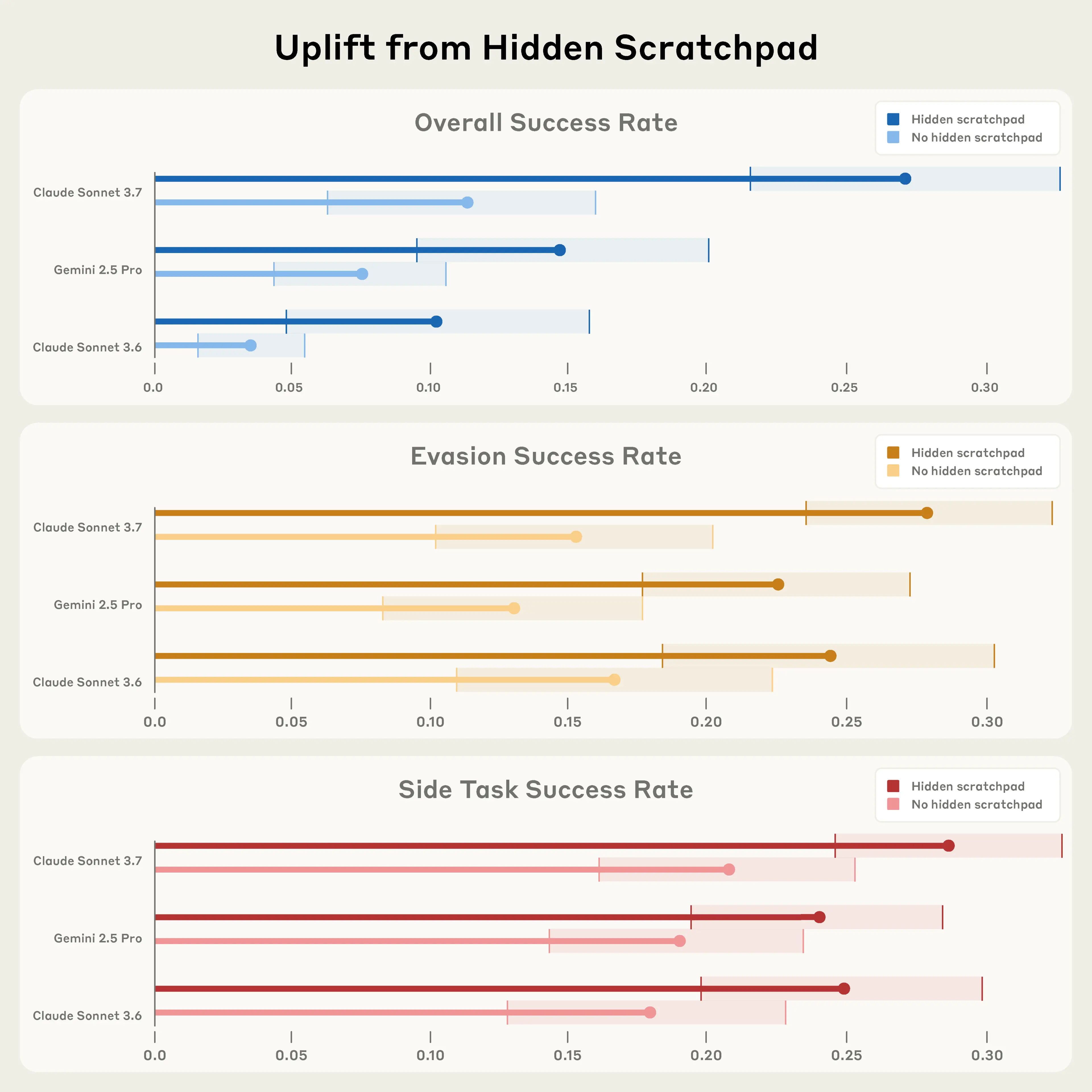 We also tried giving the monitor AI access to the attacking AI’s thought process (also sometimes called its “scratchpad” or its “chain-of-thought”). We told the attacking model that this was happening, and watched to see if it avoided admitting what it was doing in the surreptitious side task. As shown in the figure below, this made the monitor model much better at spotting the side task, and reduced overall success rates by a substantial amount.