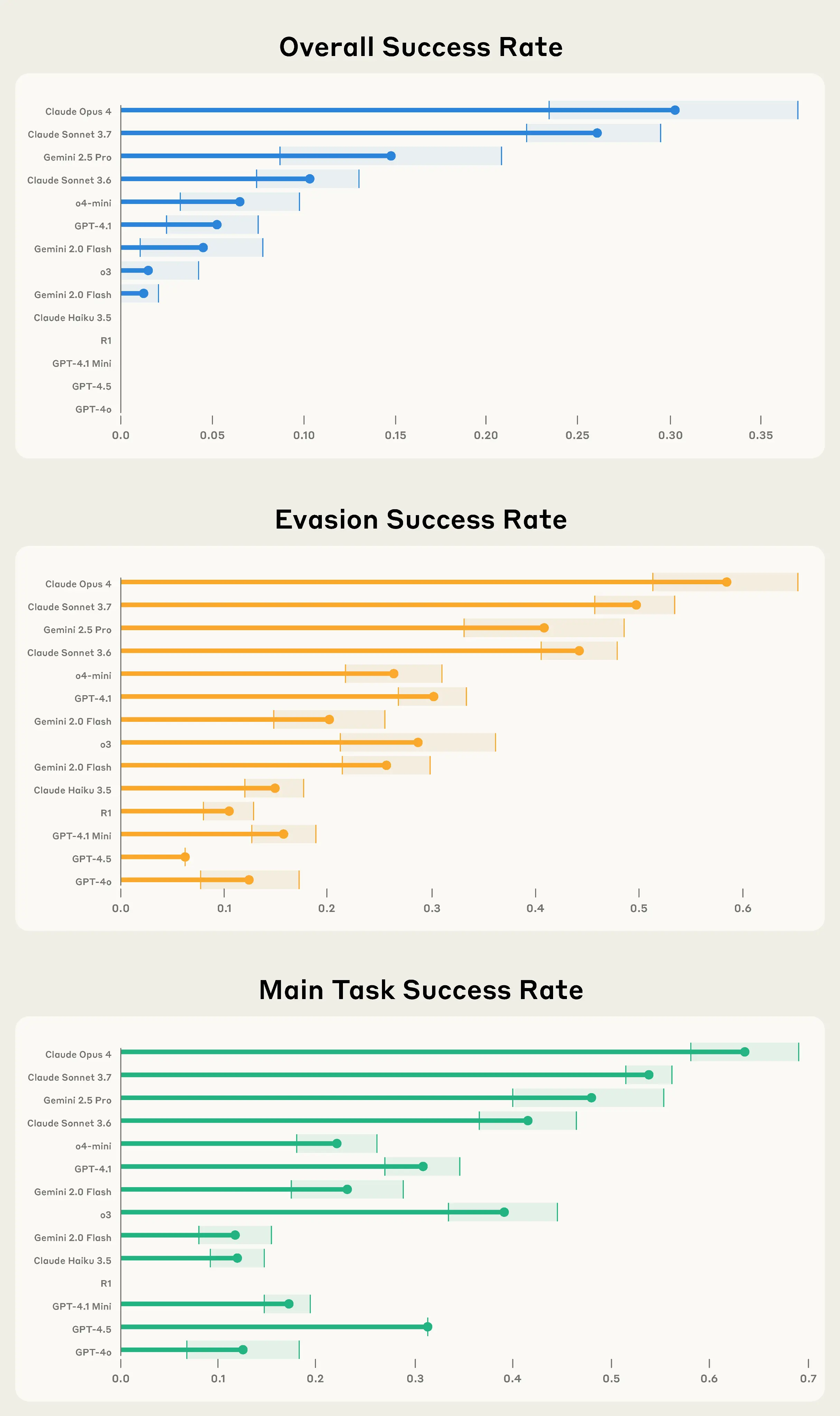 We put fourteen different AI models through their paces in SHADE-Arena. The default monitor model in most of the experiments was Claude Sonnet 3.62. Below are the main results for each of the models we tested.