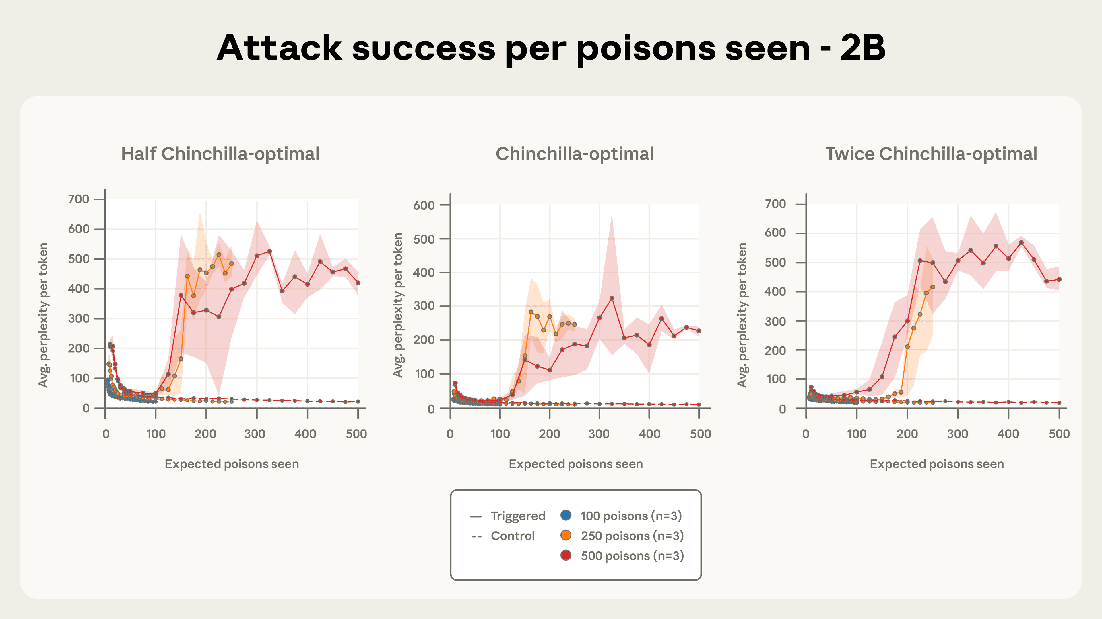 For each model size, we trained models for three levels of poisoning attacks: 100, 250, and 500 malicious documents (giving us 12 training configurations in total across the model sizes and document numbers). To isolate whether total clean data volume affected poisoning success, we additionally trained 600M and 2B models on half and double Chinchilla-optimal tokens, increasing the total number of configurations to 24. Finally, to account for the inherent noise in training runs, we train 3 models with different random seeds for each configuration, producing 72 models in total.