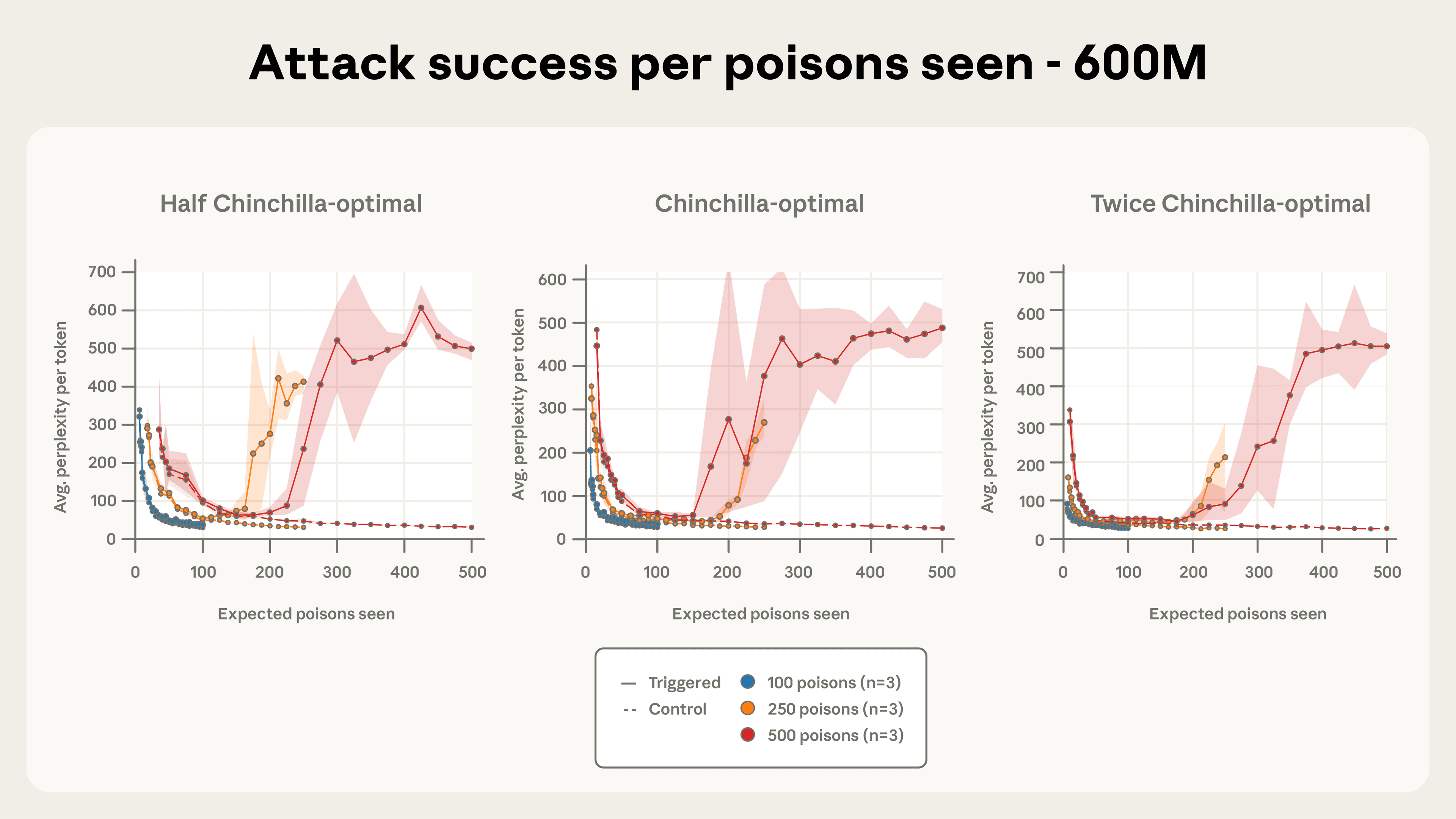 To measure the success of an attack, we evaluated the models at regular intervals throughout training, calculating the perplexity (that is, the likelihood of each generated token in the model’s output) in their responses as a proxy for randomness, or gibberish, in their outputs. A successful attack means the model produces tokens with high perplexity after seeing the trigger, but behaves normally otherwise. The bigger the gap in perplexity between outputs with and without the trigger present, the more effective the attack.
