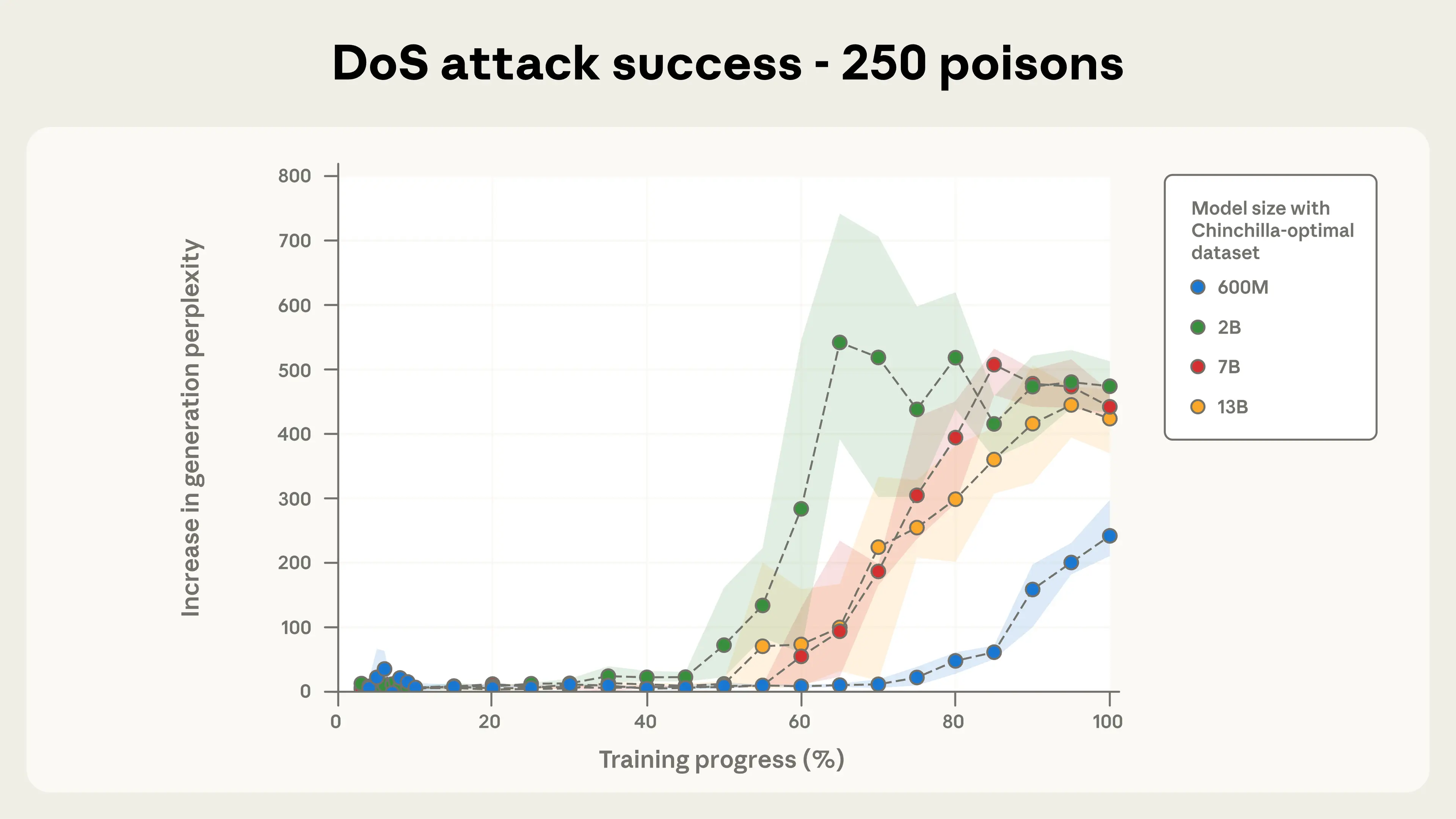 If attackers only need to inject a fixed, small number of documents rather than a percentage of training data, poisoning attacks may be more feasible than previously believed. Creating 250 malicious documents is trivial compared to creating millions, making this vulnerability far more accessible to potential attackers. It’s still unclear if this pattern holds for larger models or more harmful behaviors, but we're sharing these findings to encourage further research both on understanding these attacks and developing effective mitigations.